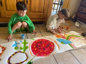 Nous avons d’abord déposé quelques noisettes de peinture acrylique que Firmin a ensuite étalée avec un rouleau. On peut choisir de ne mettre qu’une couleur ou de faire des effets en mettant plusieurs couleurs.