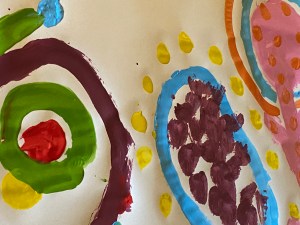 Pour cela, on a décidé ensemble dans quel sens pousseraient les fleurs et c’était parti, ils ont rajouté tiges et feuilles à chaque rond pour transformer cette peinture abstraite en champ de fleurs !