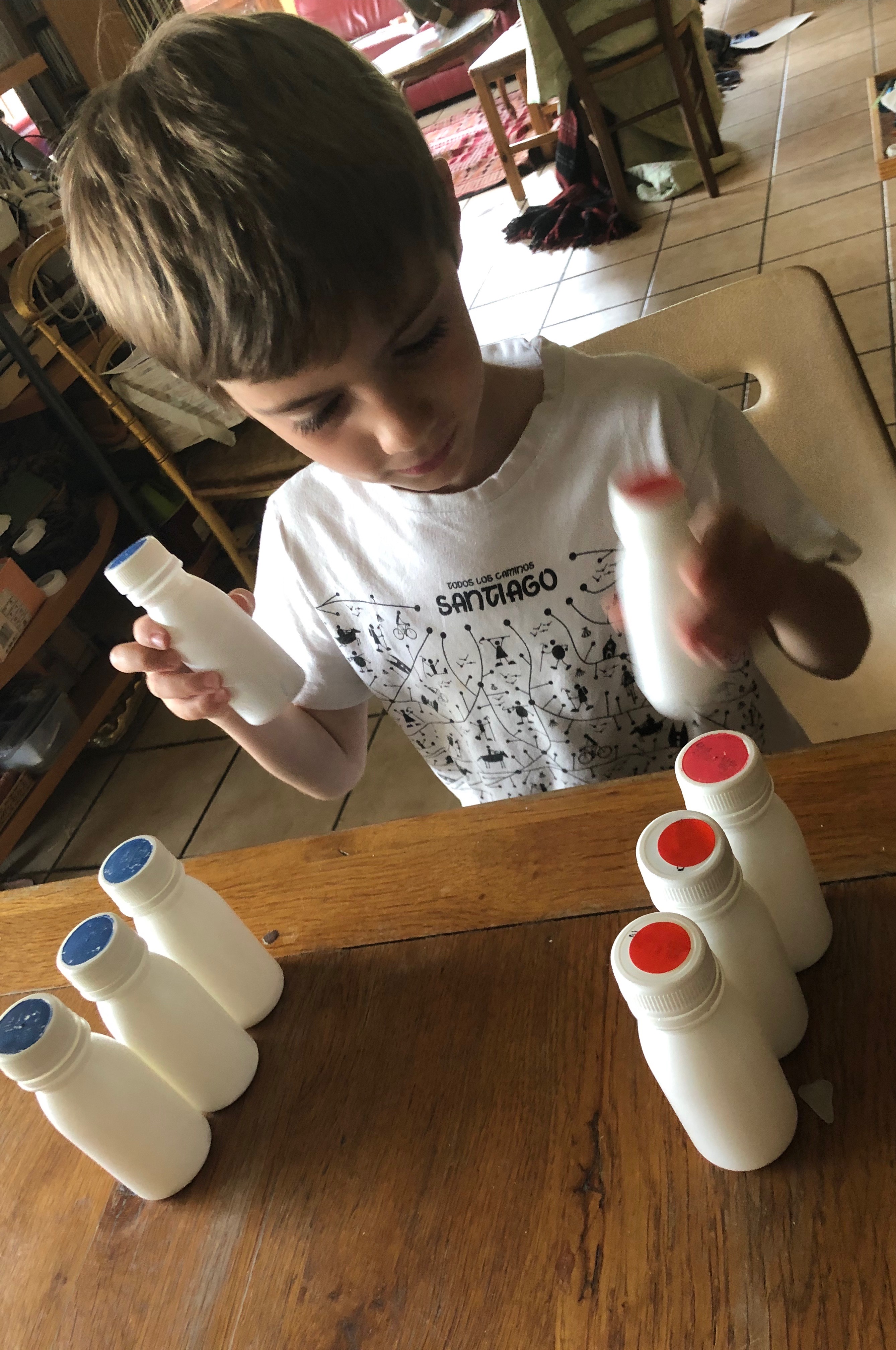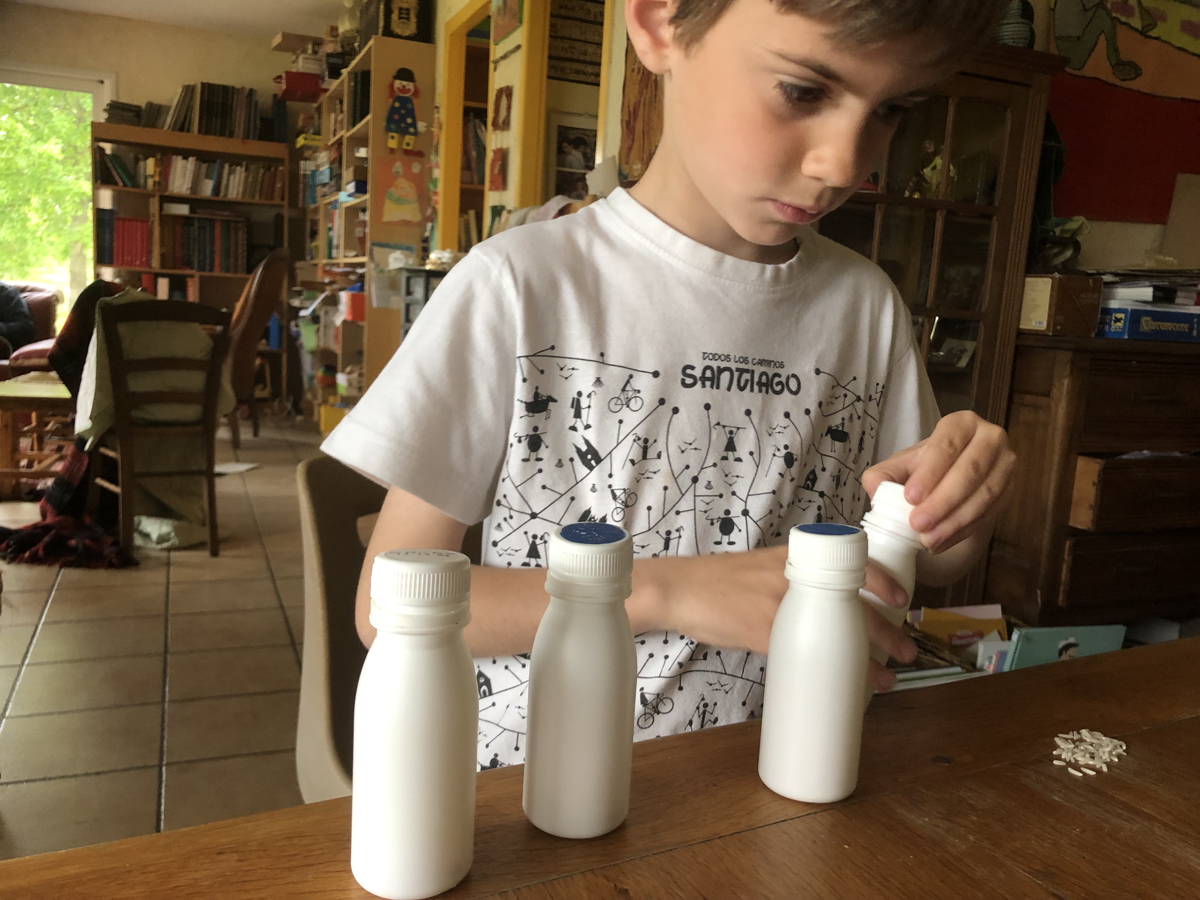 24 – Fabrique et joue avec des boîtes à sons (contenant du riz, des petits cailloux ou des perles à mettre par deux selon le bruit)
