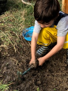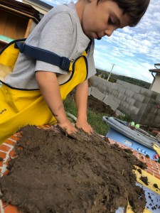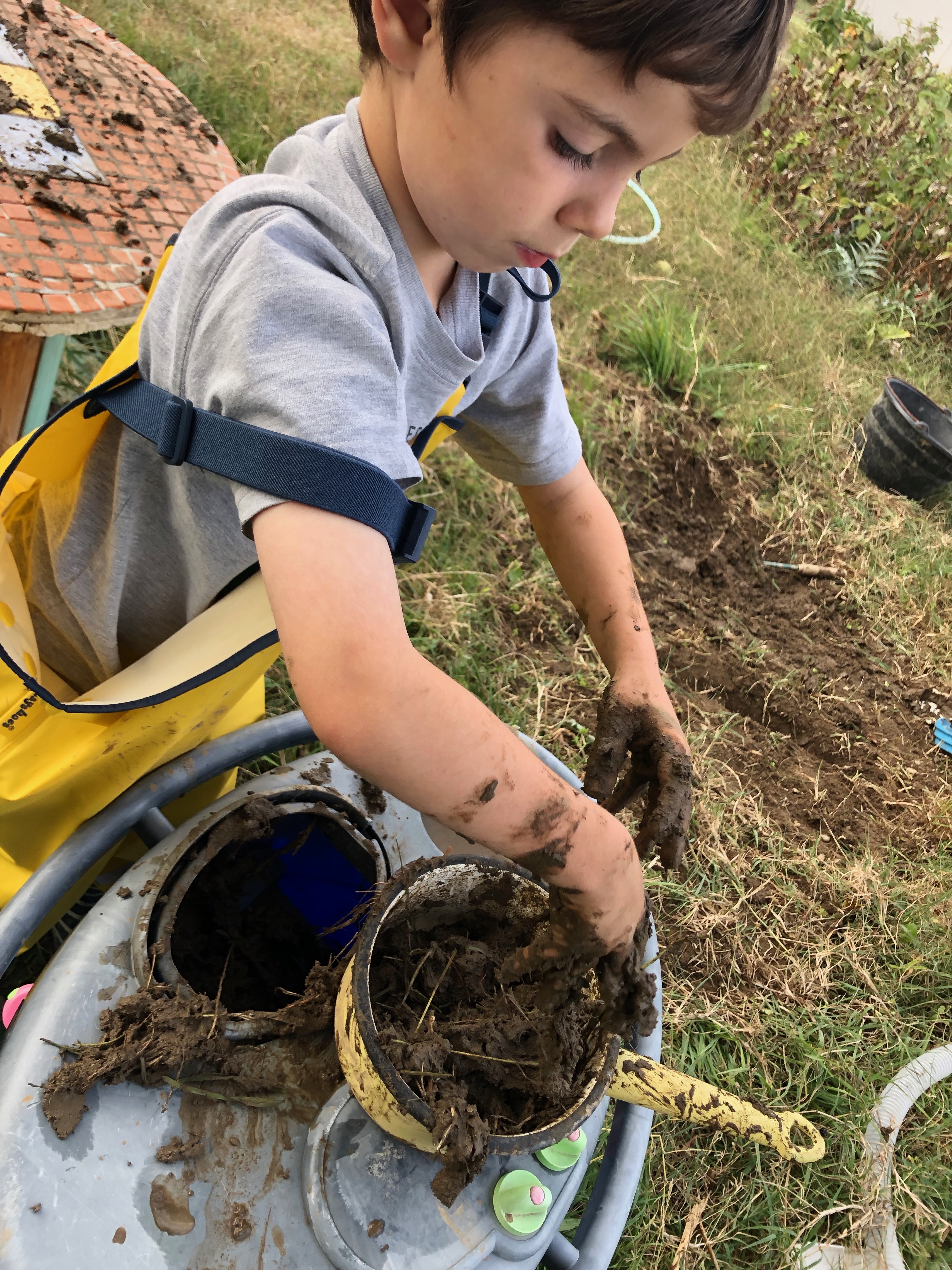 C’est l’automne ! Nous avons décidé de remettre en activité notre cuisine de boue ! (Merci au jardin des curieux de nous y avoir refait penser !)  un peu de désherbage, on ressort nos super salopettes imperméables  et c’est parti ! Firmin va chercher de l’eau au récupérateur d’eau de pluie.