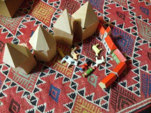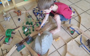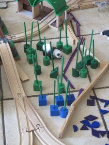Et puis parfois Noé utilise le spielgaben avec d’autres jeux : ici avec son circuit de train, kapla, pierres et animaux !