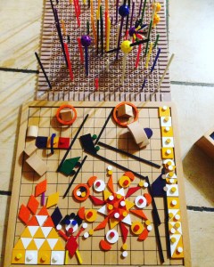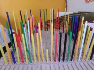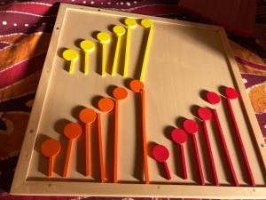 Puis classement des bâtonnets sans fiche … puis encore d’une autre couleur … et encore … (la photo est à l’envers) : on monte l’escalier avec le doigt