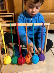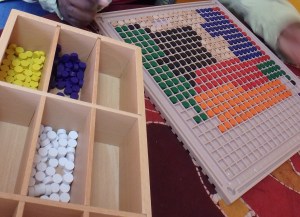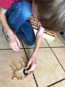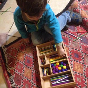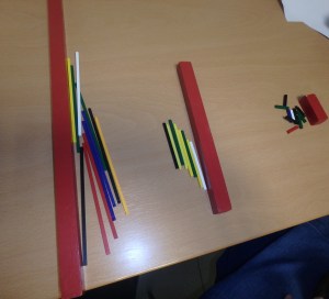 On a aussi associé les barres rouges Montessori et les petits bâtonnets de Spielgaben. Là, il s’agissait de mettre les grands d’un côté, puis les moyens, et enfin les petits de l’autre.