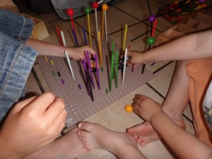 Se concentrer très fort pour arriver à mettre les bâtonnets dans les trous !
