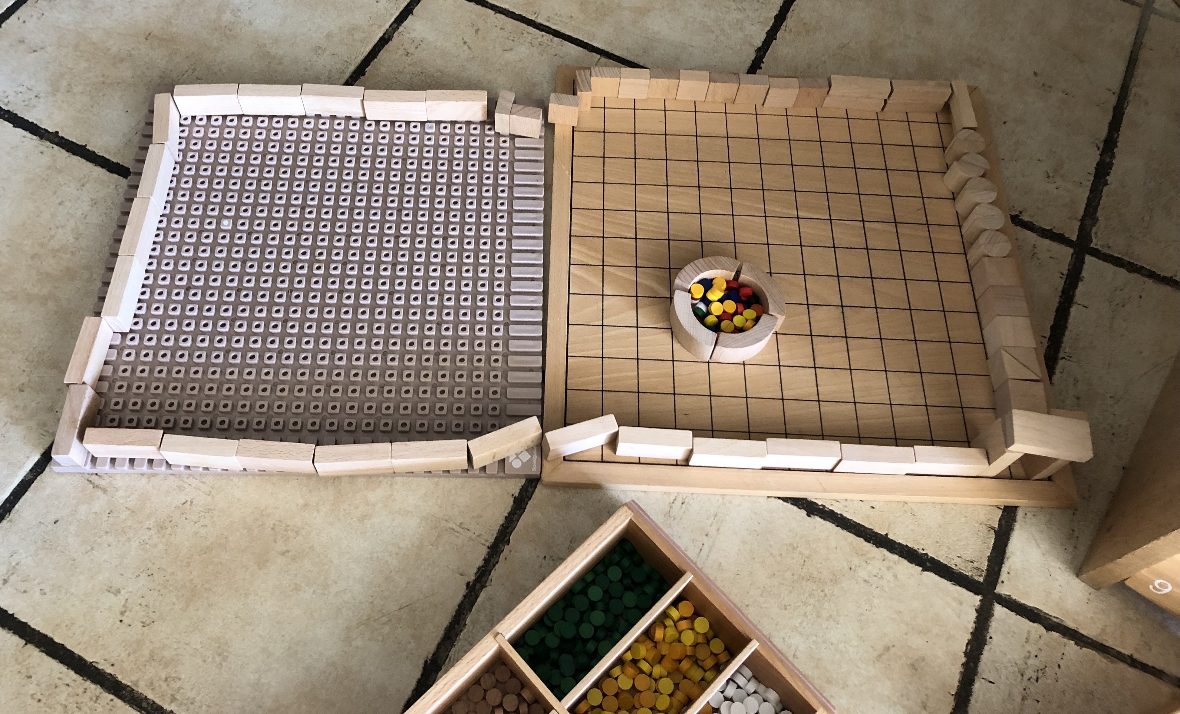 Voilà, spielgaben pour jouer, pour inventer, pour voir le monde d’une façon plus organisée, pour apprendre à maitriser ses gestes, pour apprendre, pour expérimenter, pour faire une activité avec un nombre limité d’éléments ou au contraire avec toutes les boîtes, pour jouer seul ou à plusieurs mains, pour représenter quelque chose ou faire une belle composition mais qui ne ressemble à rien de connu ! Mille et une façons de l’utiliser, de façon totalement libre ou très dirigée, tout est possible et c’est ce que j’aime ! Ca fait trois ans que nous l’avons, et je l’aime toujours autant ! A certaines périodes, il est un peu oublié et à d’autres, il sert quotidiennement ! Souvent, il suffit que je m’installe moi-même pour y jouer et hop !!! L’intérêt renaît et les enfants se précipitent !!!