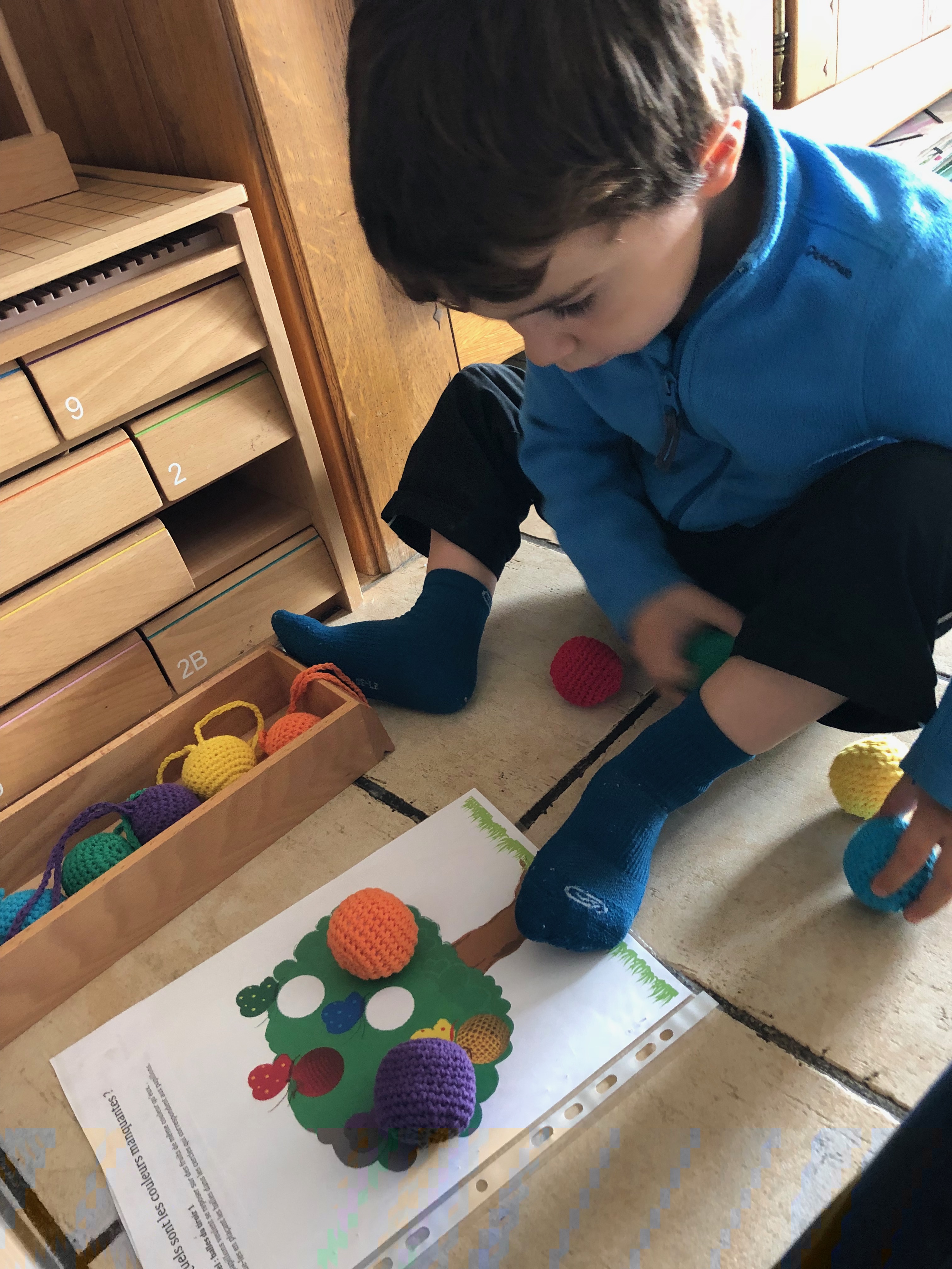 Activités autour des couleurs : placer la balle de la bonne couleur sur l’objet correspondant (orange sur la carotte, jaune sur le citron …) tout en nommant les couleurs ( j’ai associé le nom de la couleur à un objet référent, toujours le même, pour que ce soit plus facile quand on parle : rouge tomate, jaune soleil, etc.)