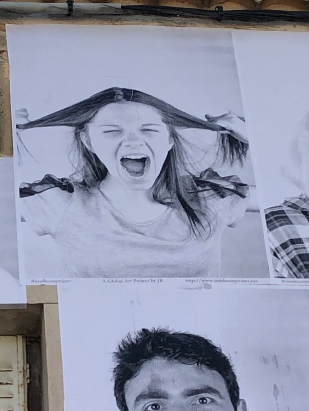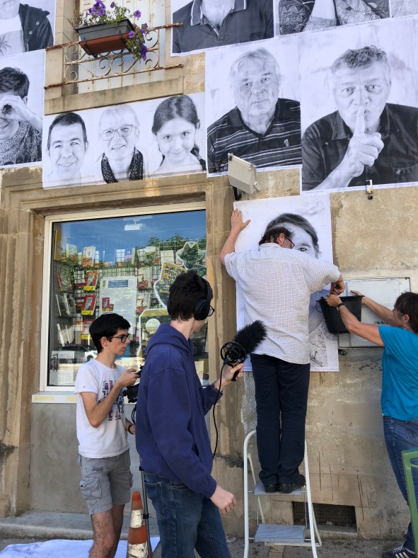 Et puis un jour, le libraire de notre village (oui, nous avons la chance d’avoir une super librairie dans notre village : le Baz’Art des Mots ) , notre libraire donc dit à Baptiste que l’artiste JR propose un projet participatif à grande échelle : Inside Out . Les participants envoient des portraits et il leur est renvoyé des impressions au format affiche à coller.