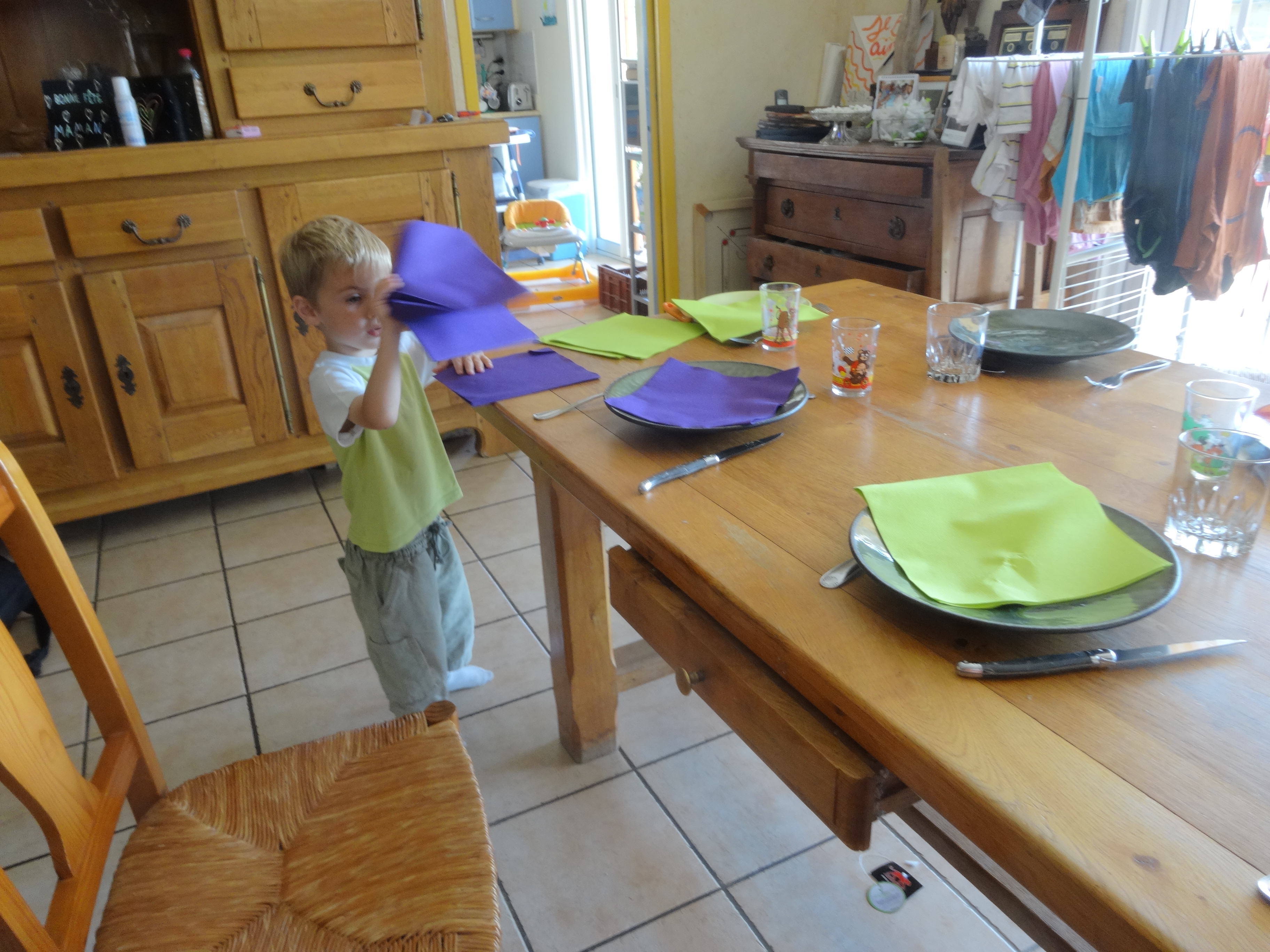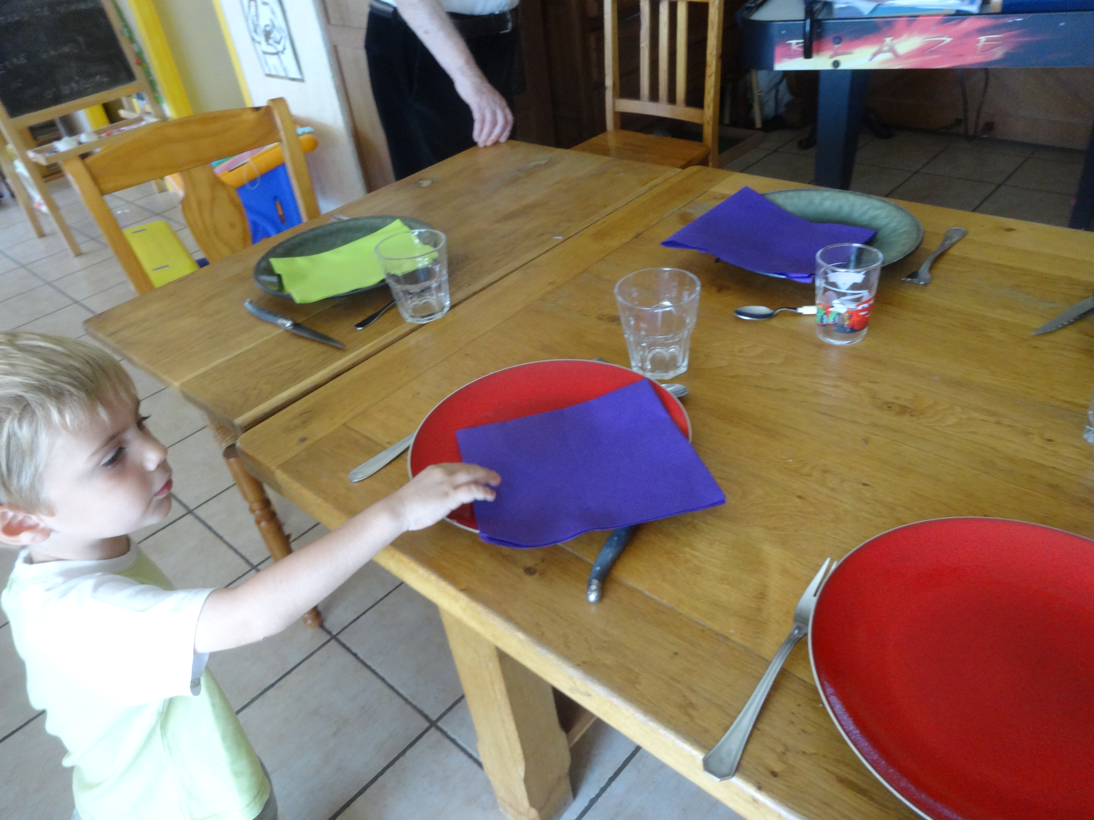 Et c’était parti ! A chaque fois, le grand (avec mes conseils) lui explique ce qu’il doit faire. Par exemple, il aidait Rémi à mettre le couvert. Je lui ai dit de mettre les petites cuillères (après avoir compté combien nous étions !!) puis Rémi lui a proposé de mettre les serviettes en papier dans les assiettes.