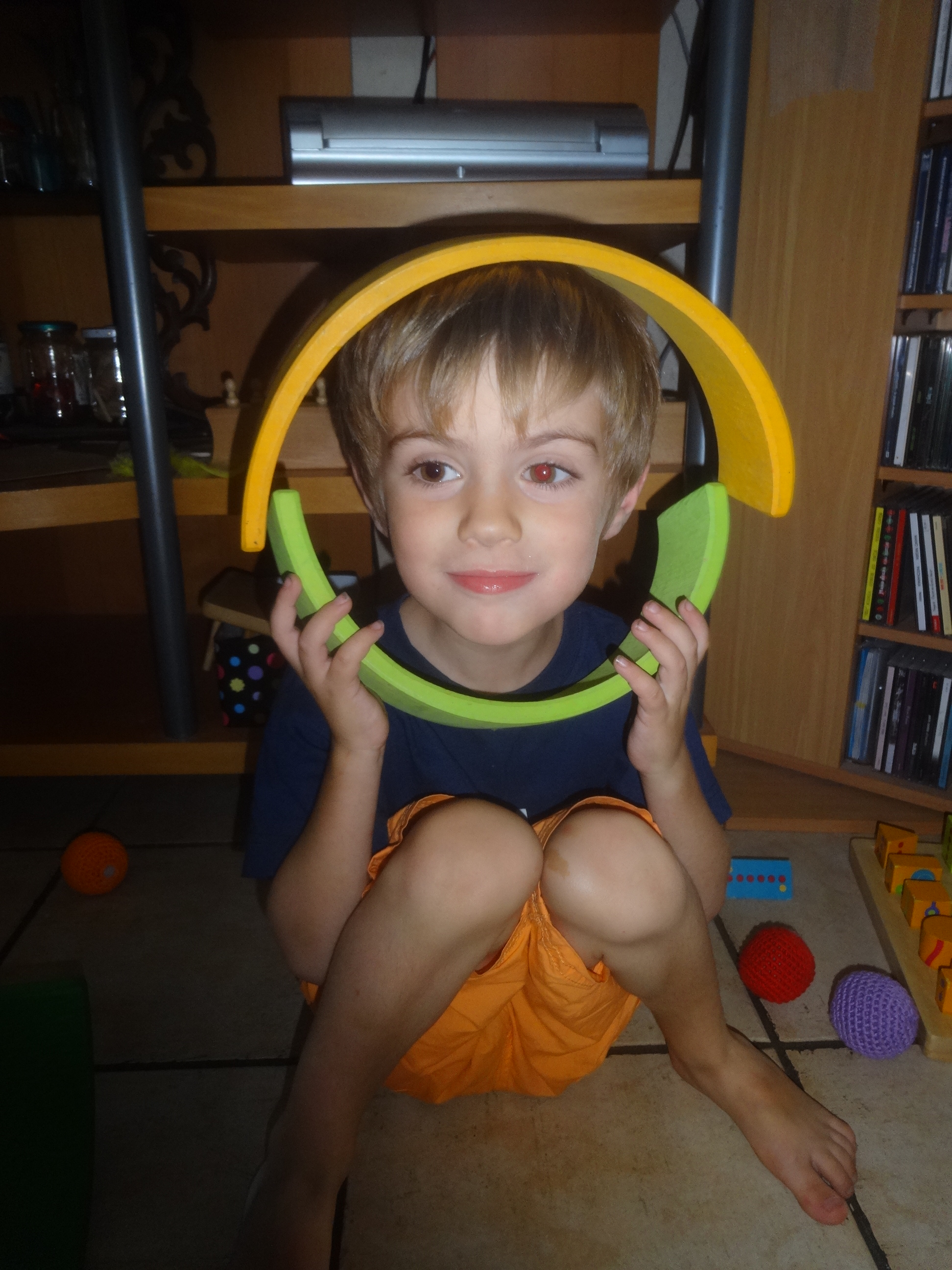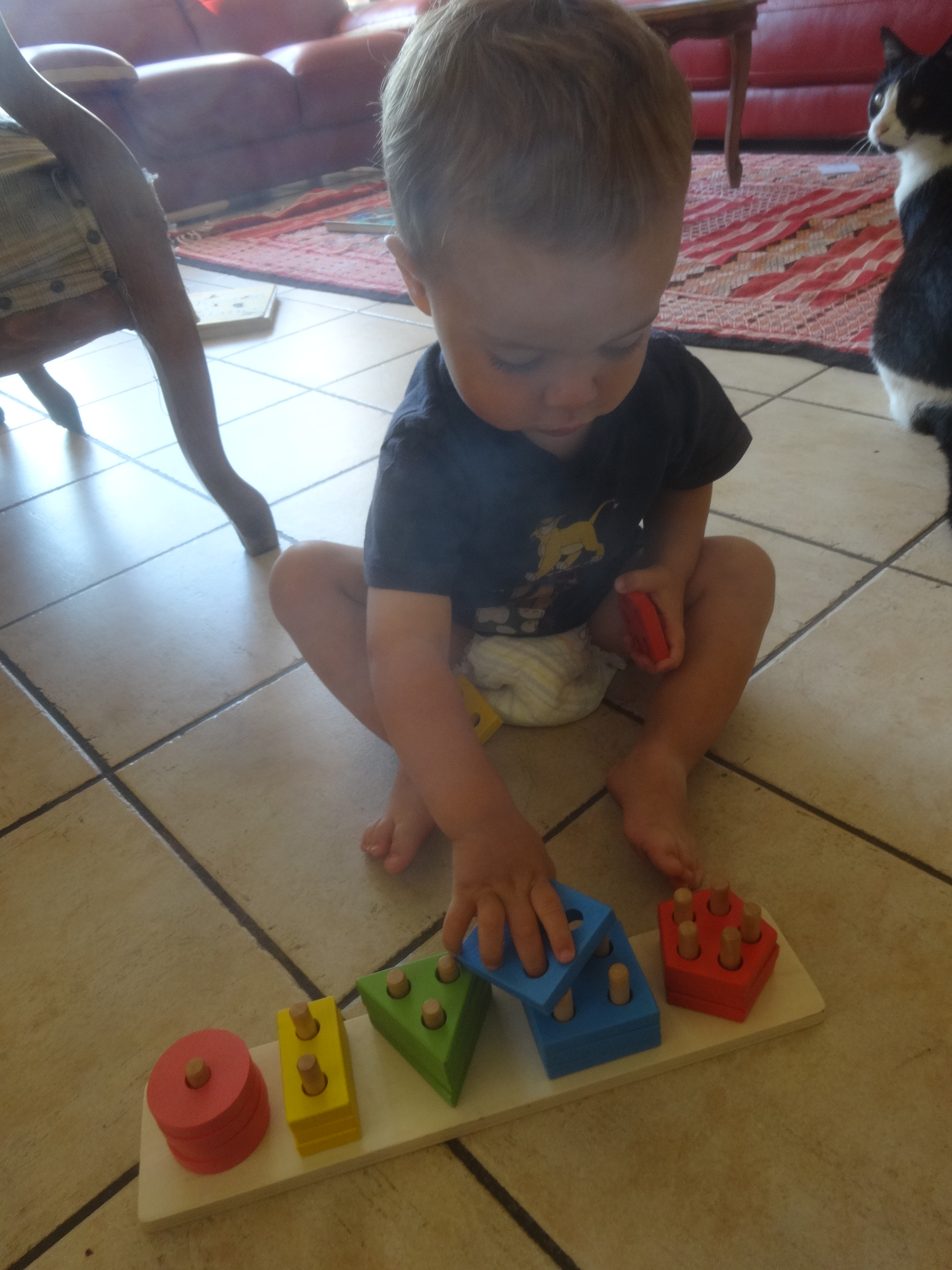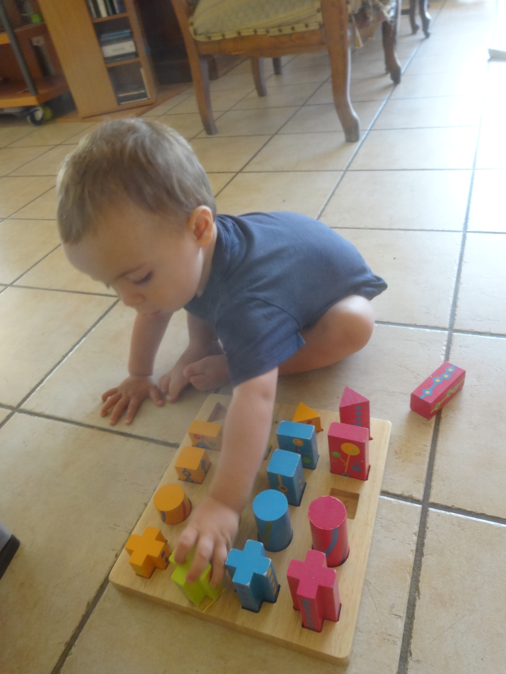 Un autre jeu qui l’attire bien mais qui résiste encore ! Mettre les ronds, ça va, les autres, c’est plus dur. Il sait bien où les mettre mais souvent ne fait rentrer qu’un bâtonnet ! Par contre, j’ai été très étonnée de l’entendre dire « arré ! » et « i-angle ! ».DSC02930