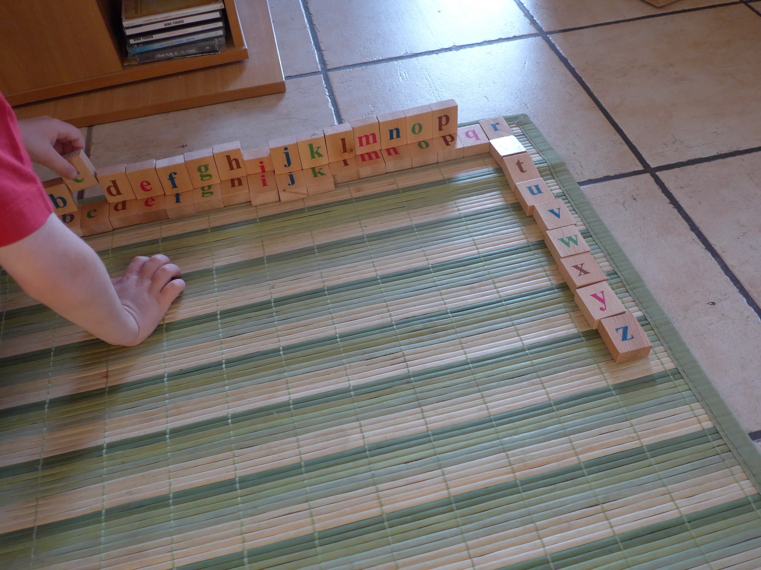 J’ai aussi une boîte avec des lettres normalement plutôt pour Noé mais Firmin aime bien jouer avec et me demande : et ça c’est quoi ? Et ça c’est quoi ?