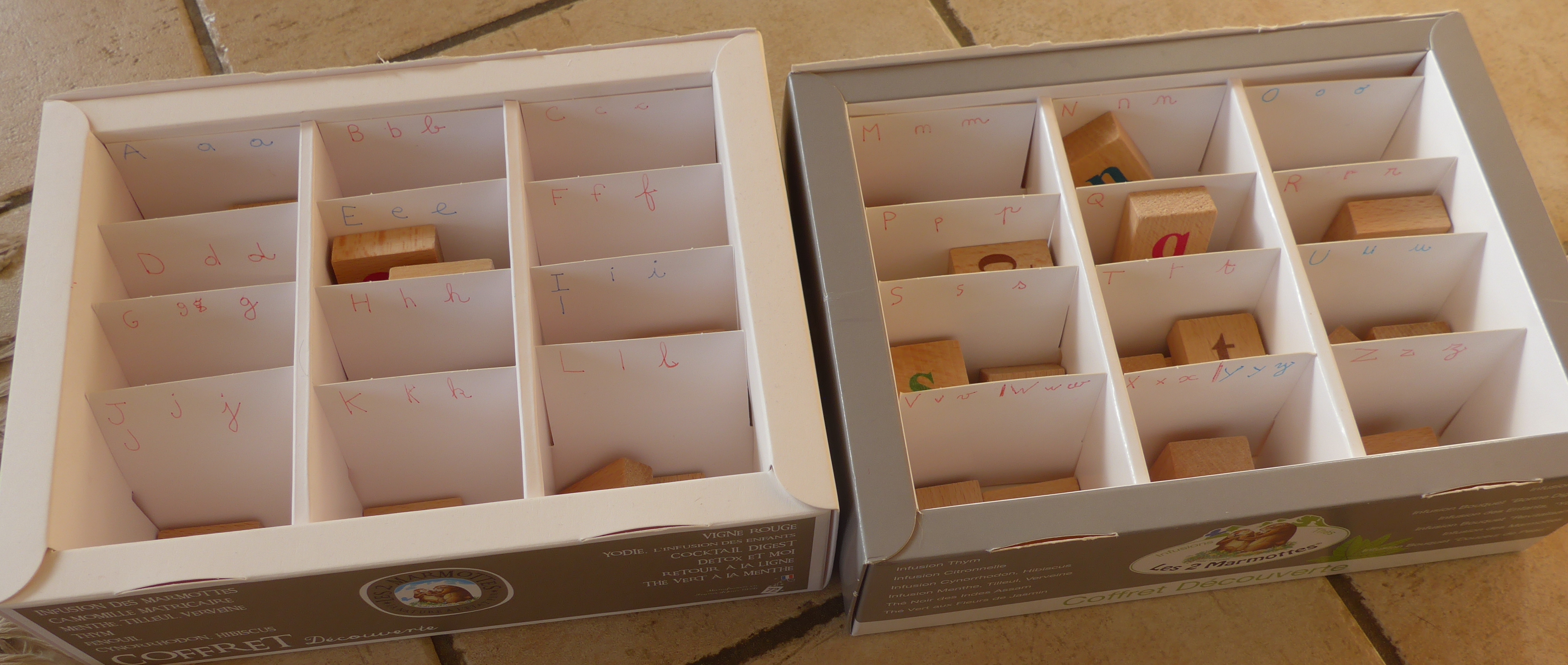 J’ai des lettres en bois depuis un moment et je me suis dit que ce serait bien de les présenter à Noé un peu façon alphabet mobile Montessori , une lettre par case… J’ai trouvé pour ça des boîtes parfaites ! Des coffrets découvertes de tisanes les deux marmottes ! Nickel !P1020713