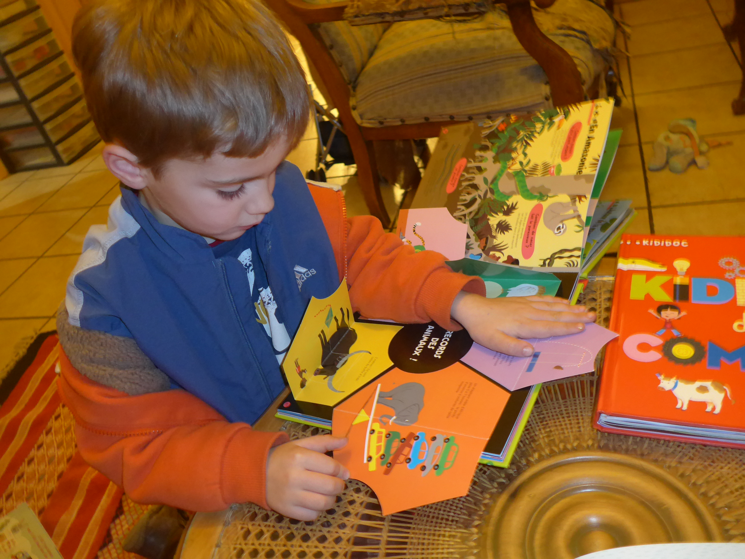 Noé aime beaucoup qu’on lui lise et il passe aussi du temps à les regarder tout seul, à soulever , tirer, tourner …