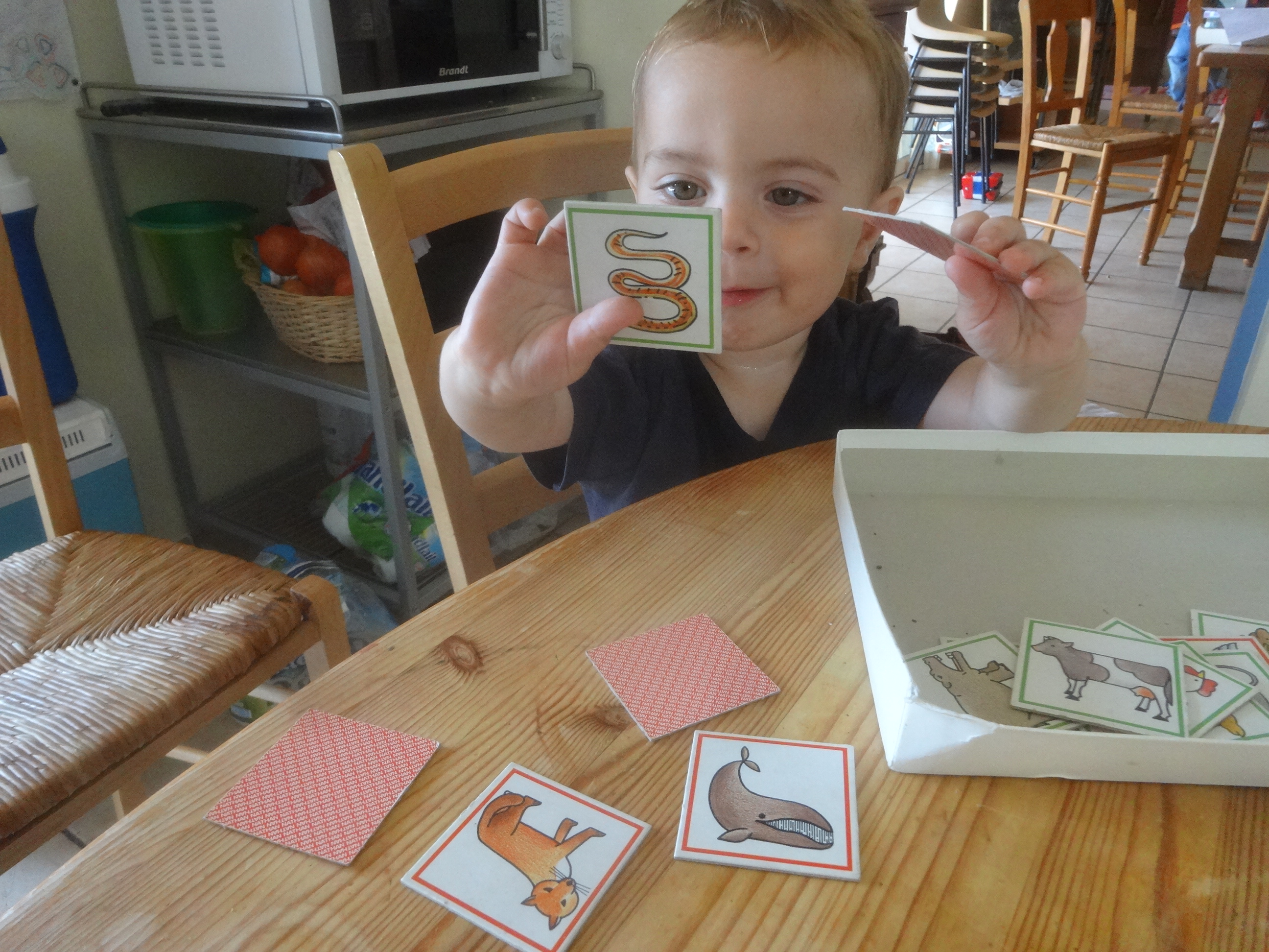 Son papi a trouvé aux puces (oui, le même jour que la fois où il a trouvé plein d’éléments de construction !) ce petit jeu de cartes avec des animaux. Les dessins sont bien faits, sur fond blanc, extra. Il était proposé en tant que loto, pour poser l’image sur la même image.
