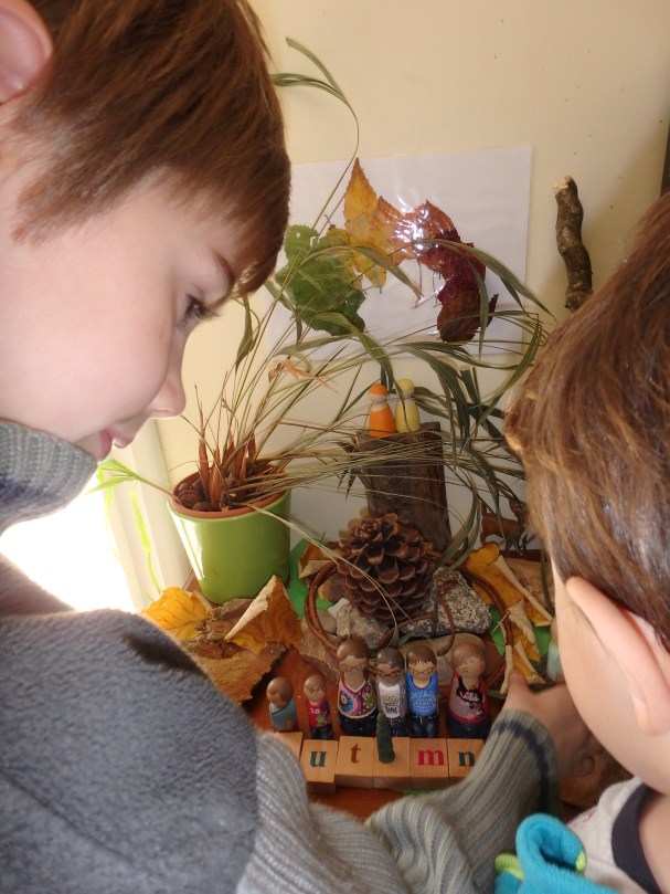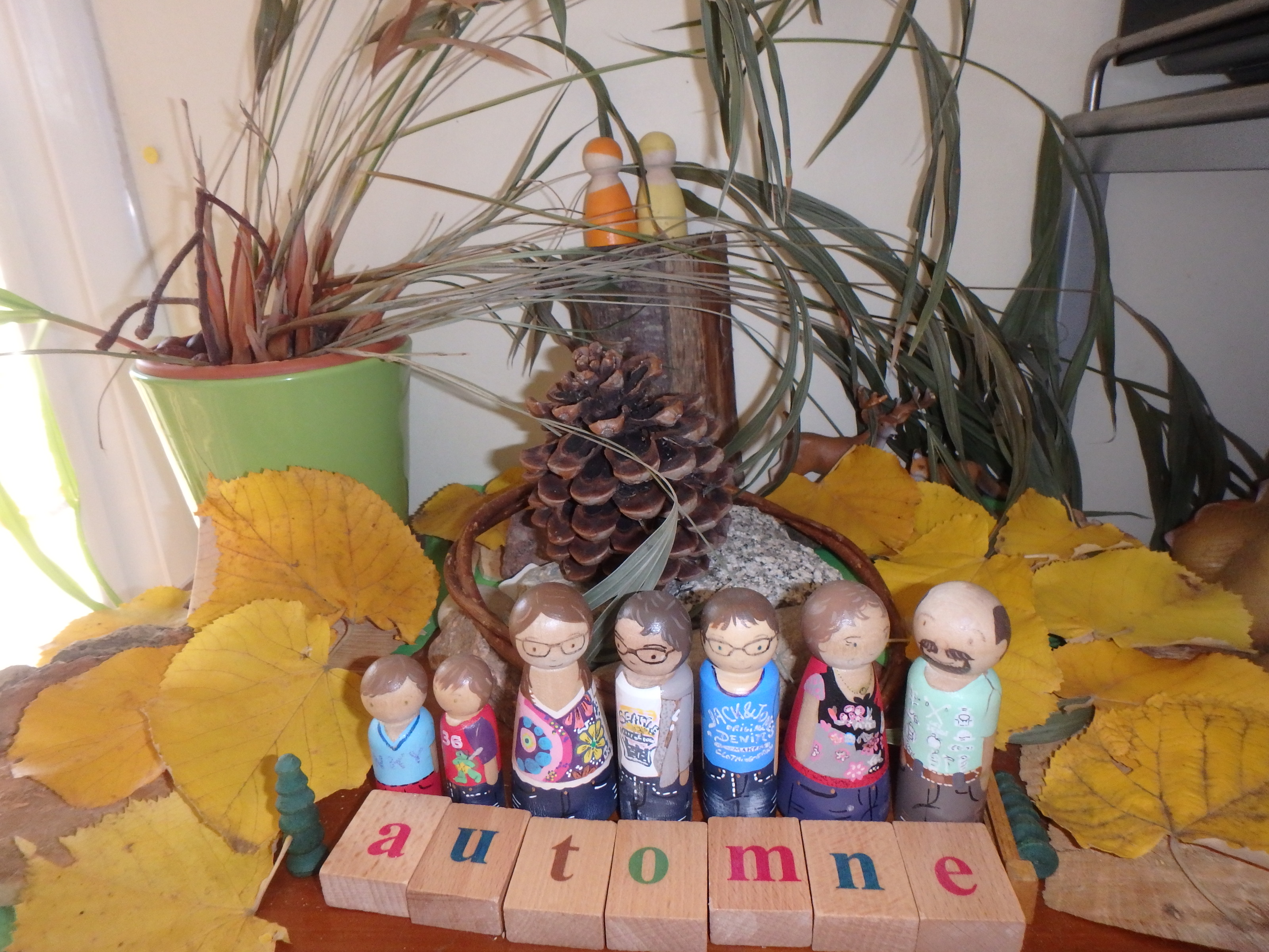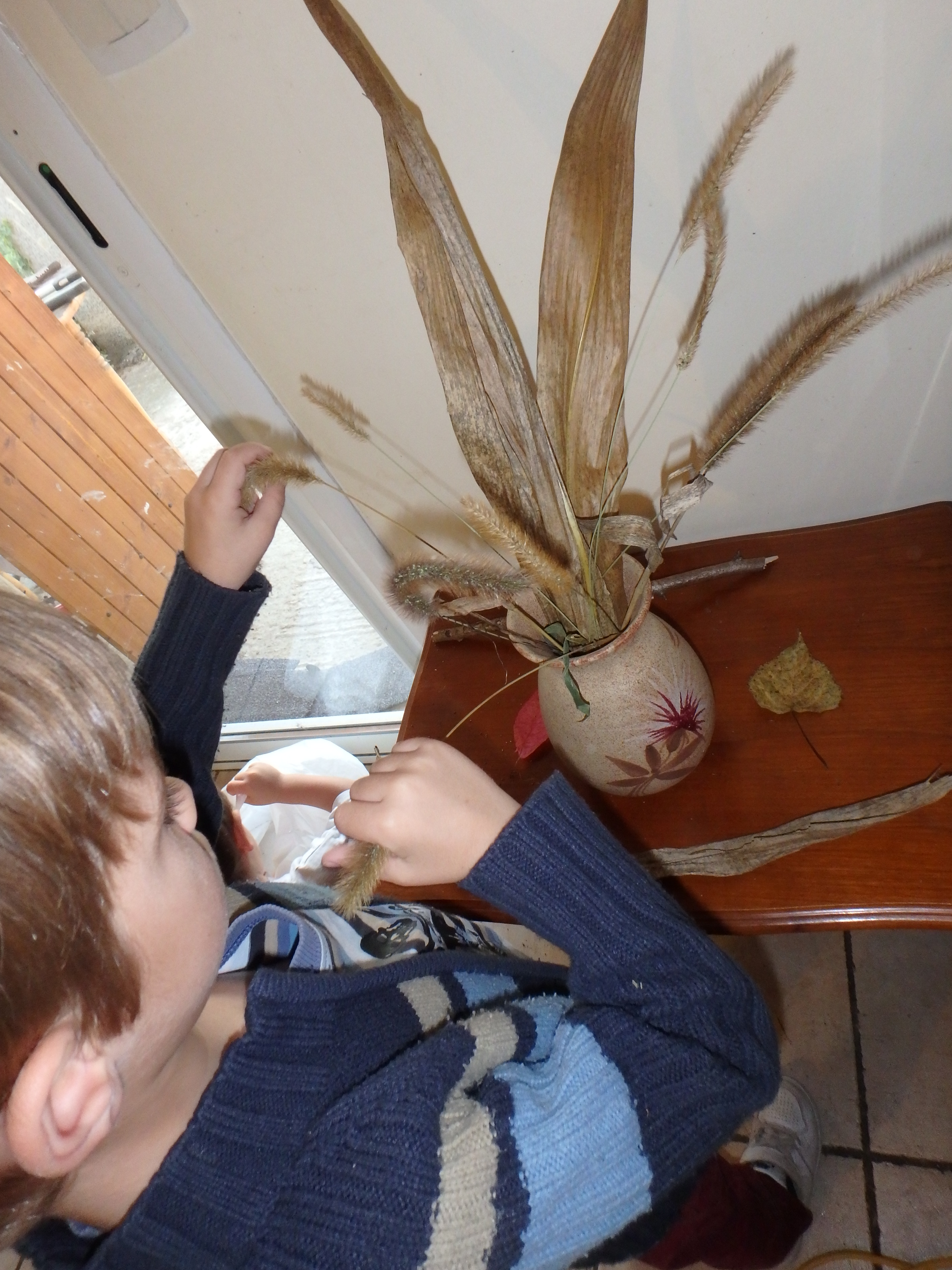 De retour à la maison, on commence notre table de la Nature/table des saisons : Les feuilles de maïs, les sétaires (maintenant qu’on sait comment ça s’appelle), quelques feuilles rouges ou jaunes … On modifiera à la prochaine sortie, très bientôt, promis !