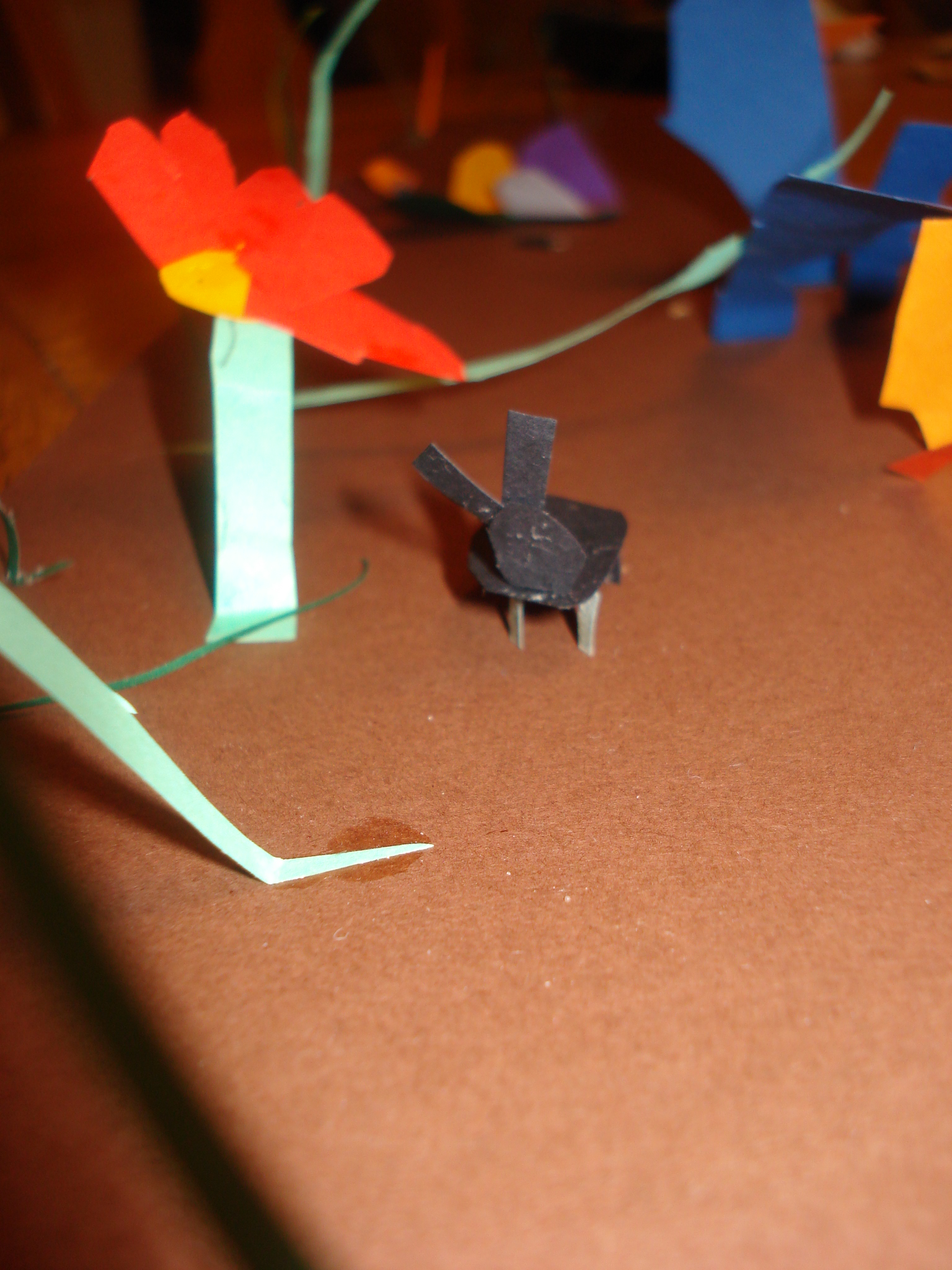 (Pendant ce temps, Firmin a trouvé l’idée excellente et il a fauché un petit pot plein de perles de rocaille qu’il s’est empressé de faire tomber par terre … Chouette, bouts de verre mélangés à des toutes petites perles … )
