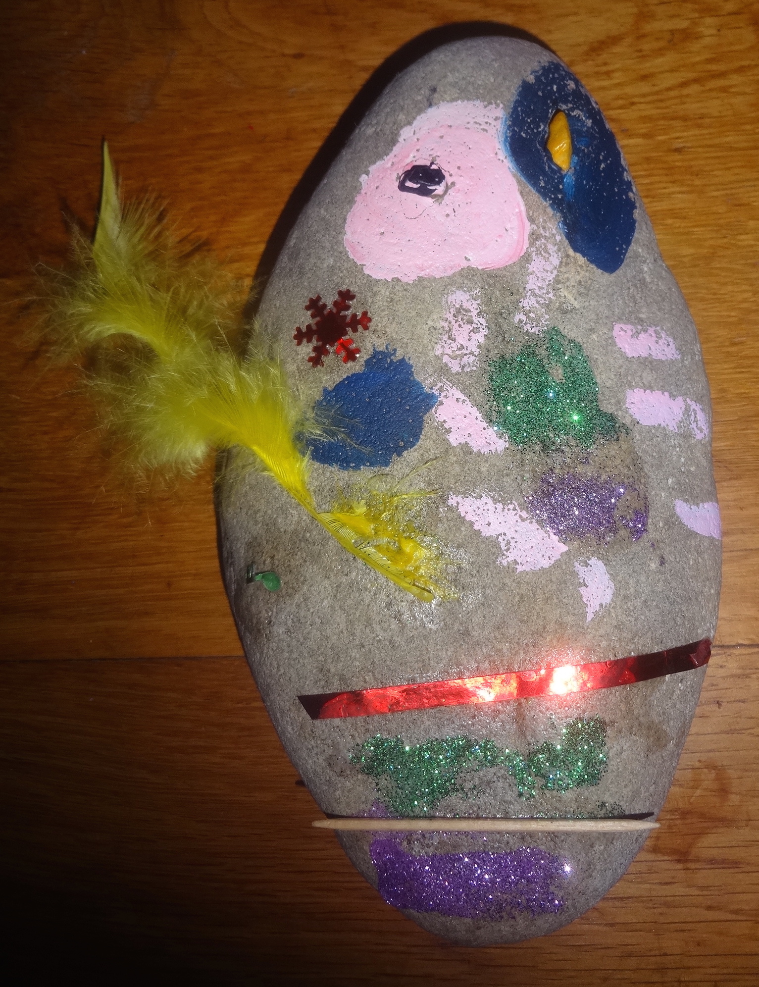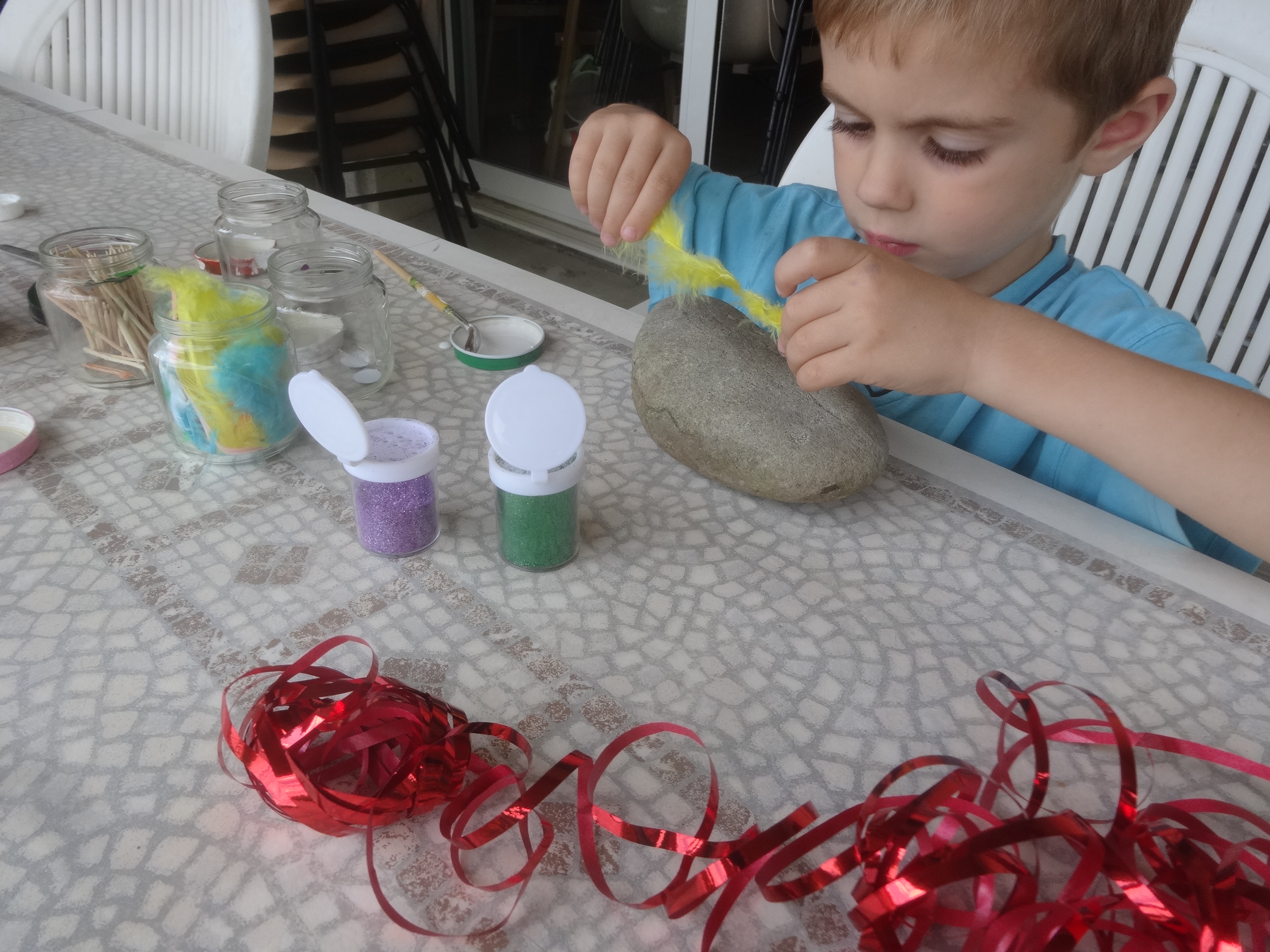 Noé l’autre jour me sort ses petits pots à trésors en me disant : « Maman, j’ai envie de faire un bricolage ! ». Pas de soucis mon coco, installe-toi dehors, je te mets un peu de colle avec un pinceau. Oui mais sur quoi coller ses petits trésors ? Un gros galet fera l’affaire ! (j’avais fait un article sur nos jeux et bricolages avec des galets)