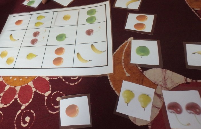 Ici, il s’agit encore d’un loto, loto des fruits, mais la nuance est que dans certaines cases, il y a le même fruit mais en quantités différentes : 1 ou 2.