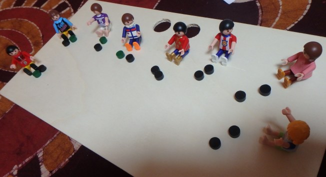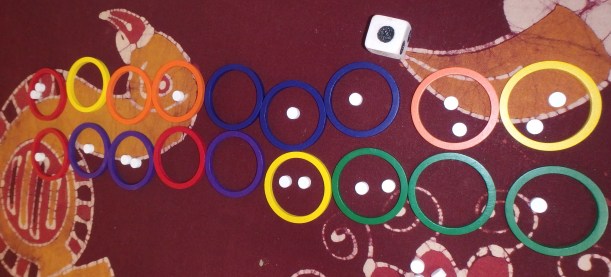 On a également joué avec un dé sur les faces duquel il y avait soit un point, soit deux points, soit rien. On lançait le dé et l’on mettait dans les cases le nombre de pions nécessaires.