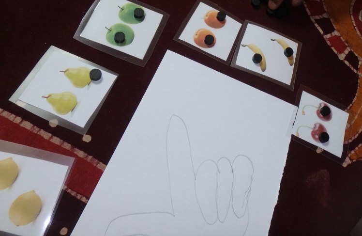 J’ai ensuite continué l’activité en associant les cartes avec deux objets avec deux doigts levés, et les cartes avec un objet avec le pouce levé.