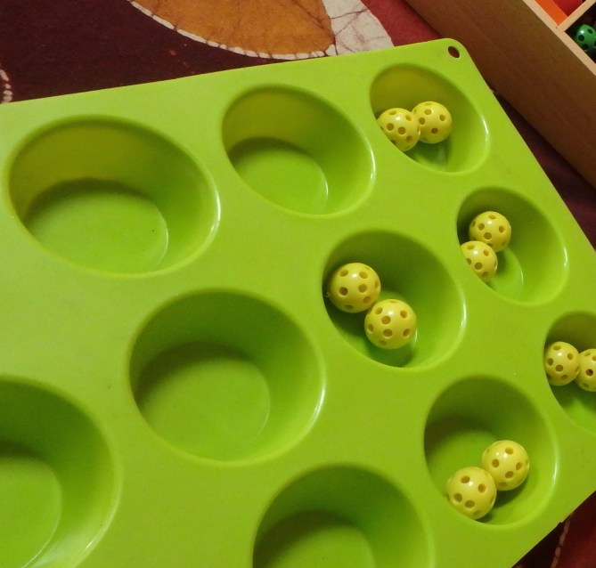 J’ai proposé ensuite une version plus simple en collant des boutons sur des bandelettes de cartons par 1, 2 ou 3, toujours à placer dans les boîtes correspondantes, ce qui était plus facile à visualiser.