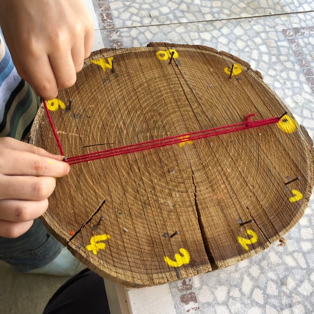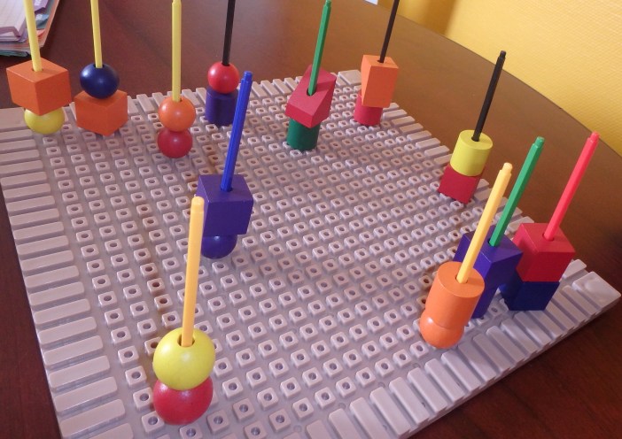 Ici, je lui faisais mes « commandes ». Des cercles colorés délimités par des cordelettes étaient sur la table. Je lui demandais : je voudrais un jaune ici, ici deux rouges … Comme ça en plus on révisait les couleurs !