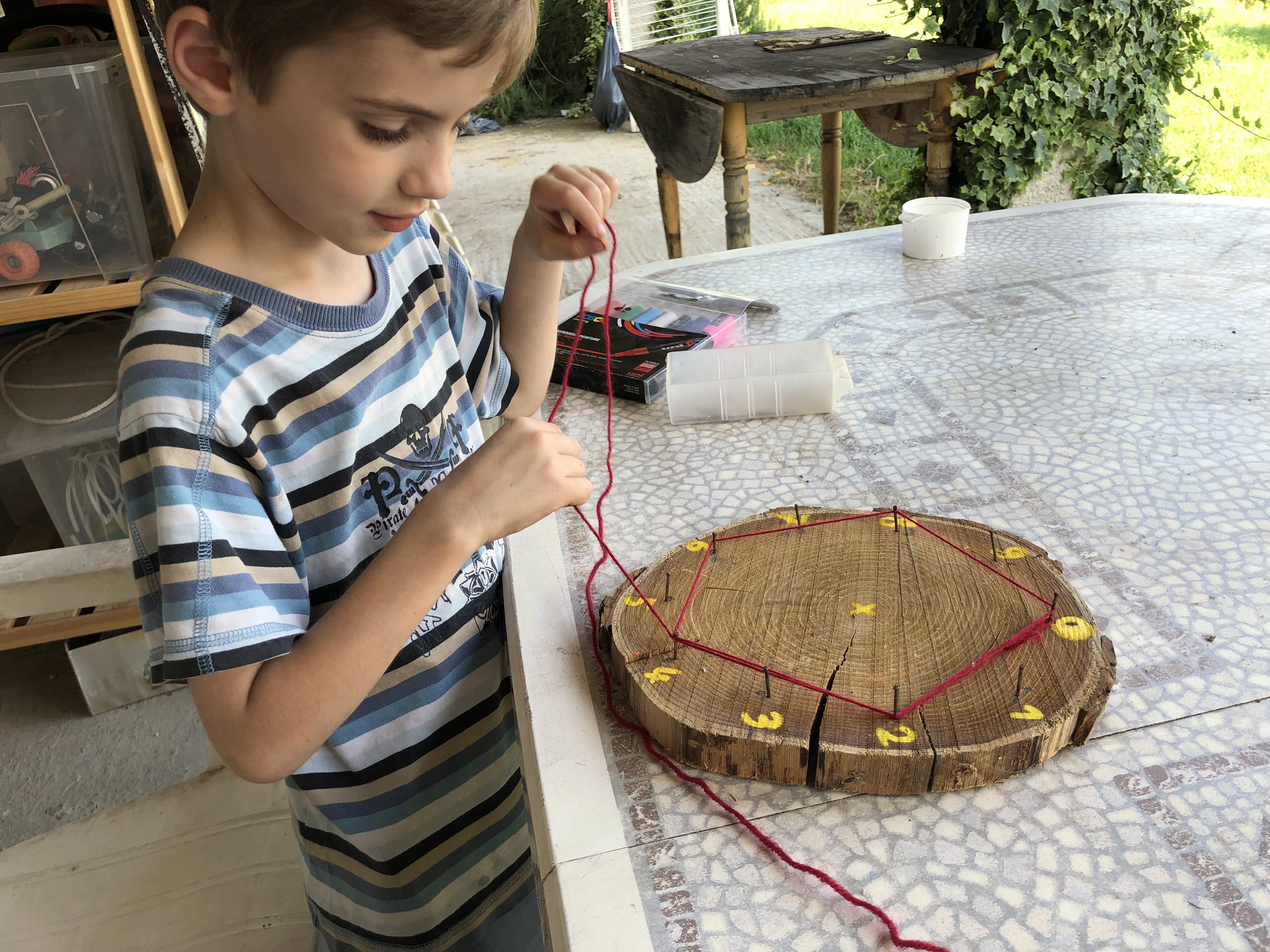 Nous avons aussi réalisé l’activité que Decroly propose ensuite : les boutons. Ici, les objets sont tous identiques, il n’y a que des boutons, seule la quantité change . J’ai coupé 18 ficelles : six portant un bouton, six, deux boutons et les six derniers, 3 boutons. La personne devait trier les groupes de boutons en les plaçant dans 3 boîtes : la boîte avec une image de 1 bouton, l’autre de 2 boutons et la troisième de 3 boutons. Decroly propose d’arriver progressivement à classer des groupes de 6 boutons.