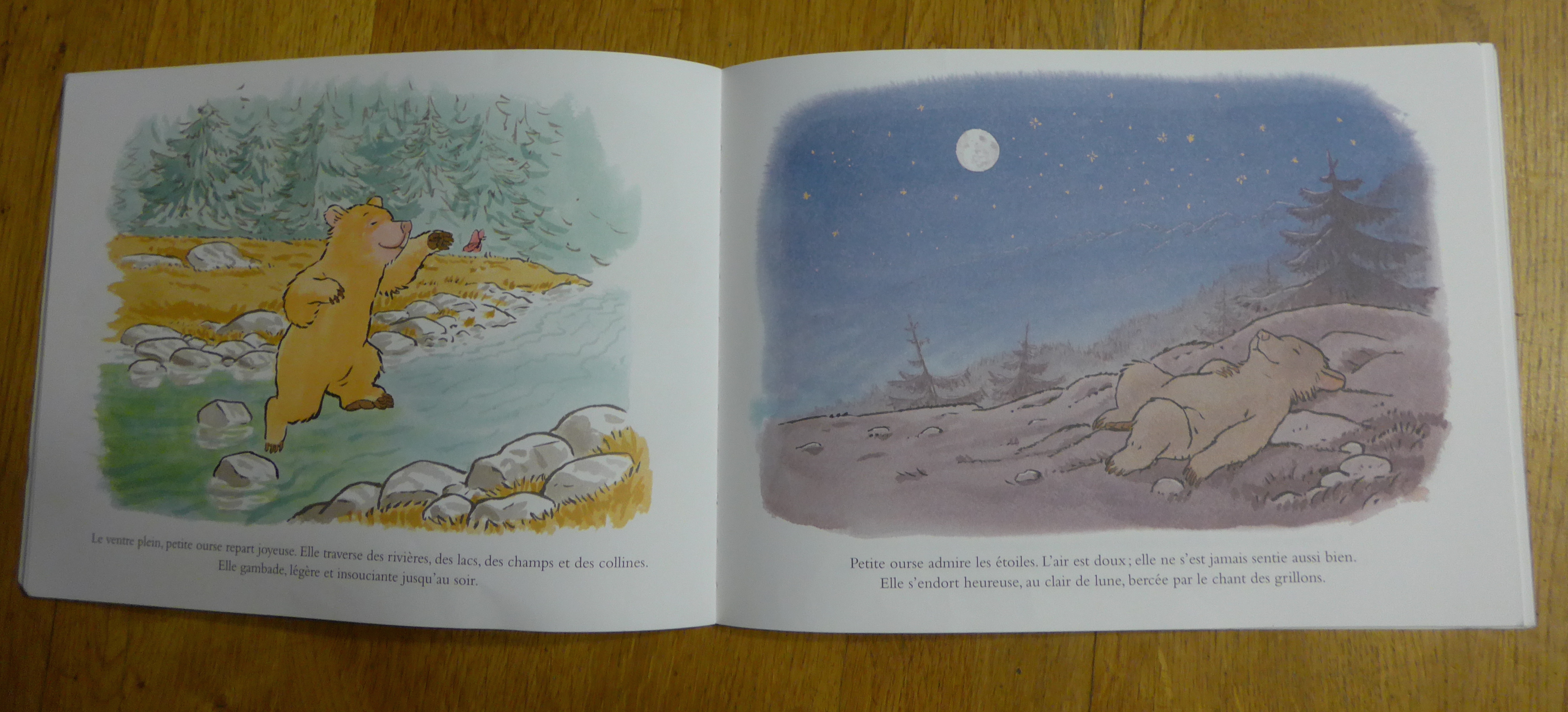 « Deux ours sont dans la montagne. Il y en a un qui part. Il rencontre un autre ours très gentil mais au qu’il y avait un trou mais il était tombé dans le trou. L’autre lui donna son baluchon et après il a pu monter en haut.