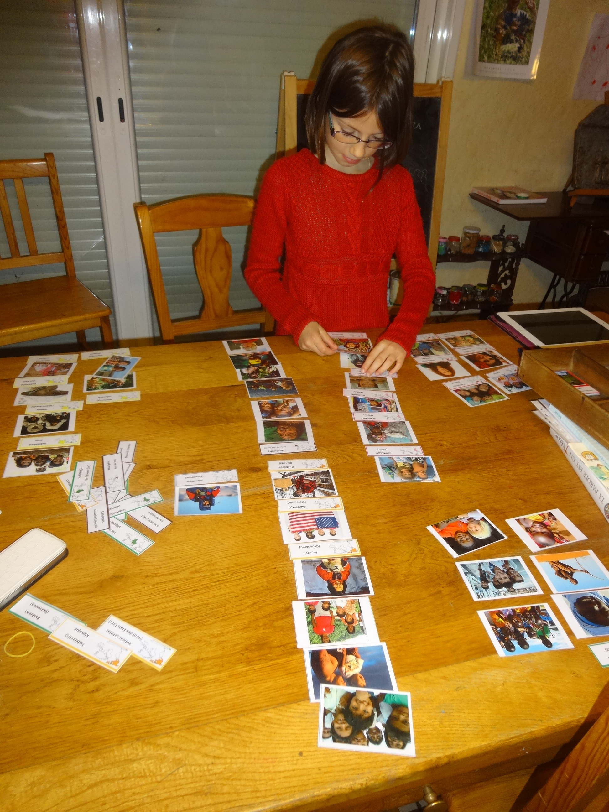 Je vous avais déjà parlé des cartes des habitants du monde. Là, Baptiste est en train de chercher la bonne étiquette à mettre sur la bonne photo. Et ensuite il vérifie avec les cartes complètes (photo +nom du pays+couleur montessorienne du continent). DSC00183