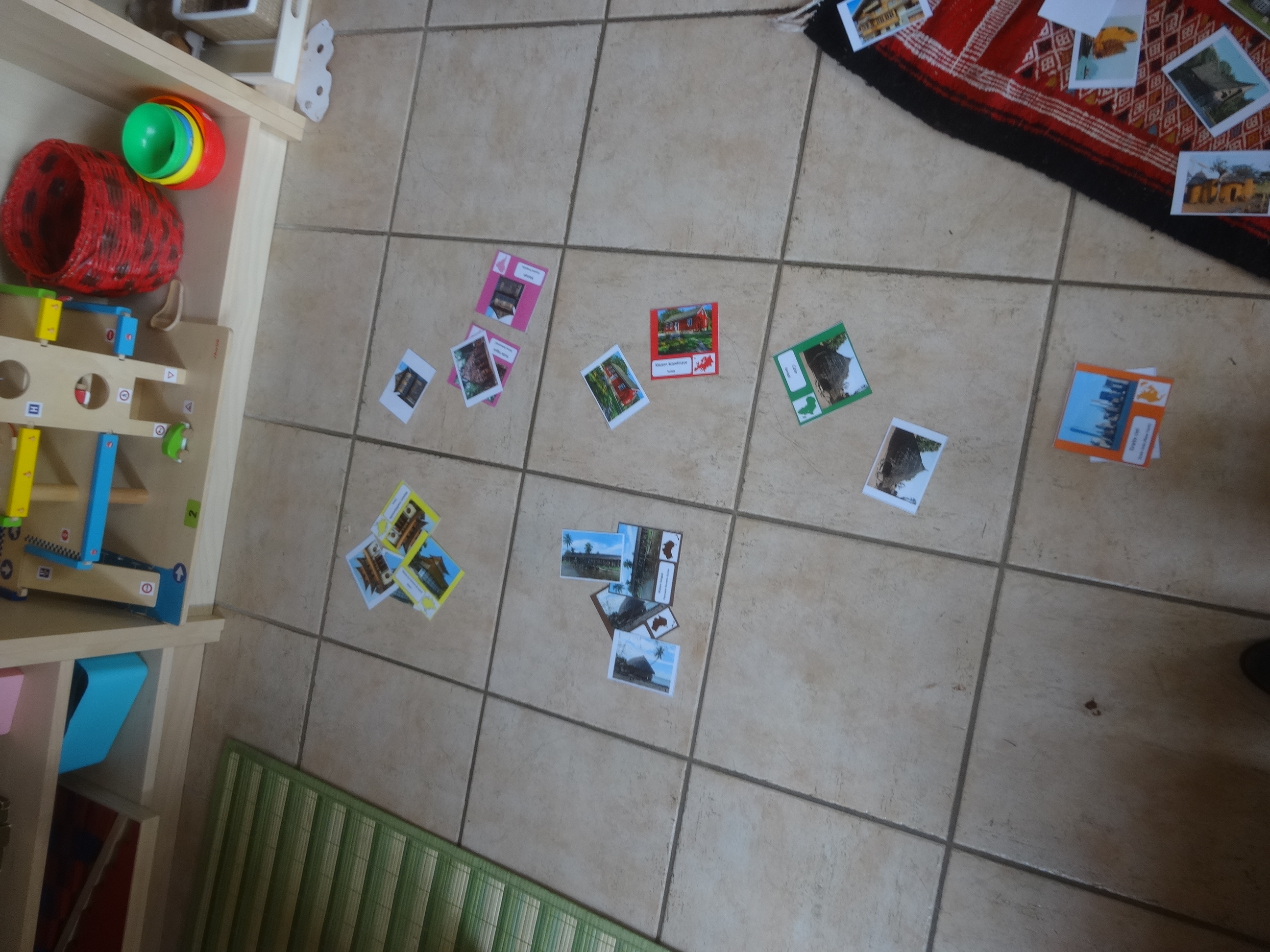 DSC00185Puis il les a mises ensemble en les triant par continent : un continent par carreau du carrelage ! Bon, il a saturé u bout d’un moment et n’a pas fait toutes les cartes mais ce n’est pas bien grave !!!