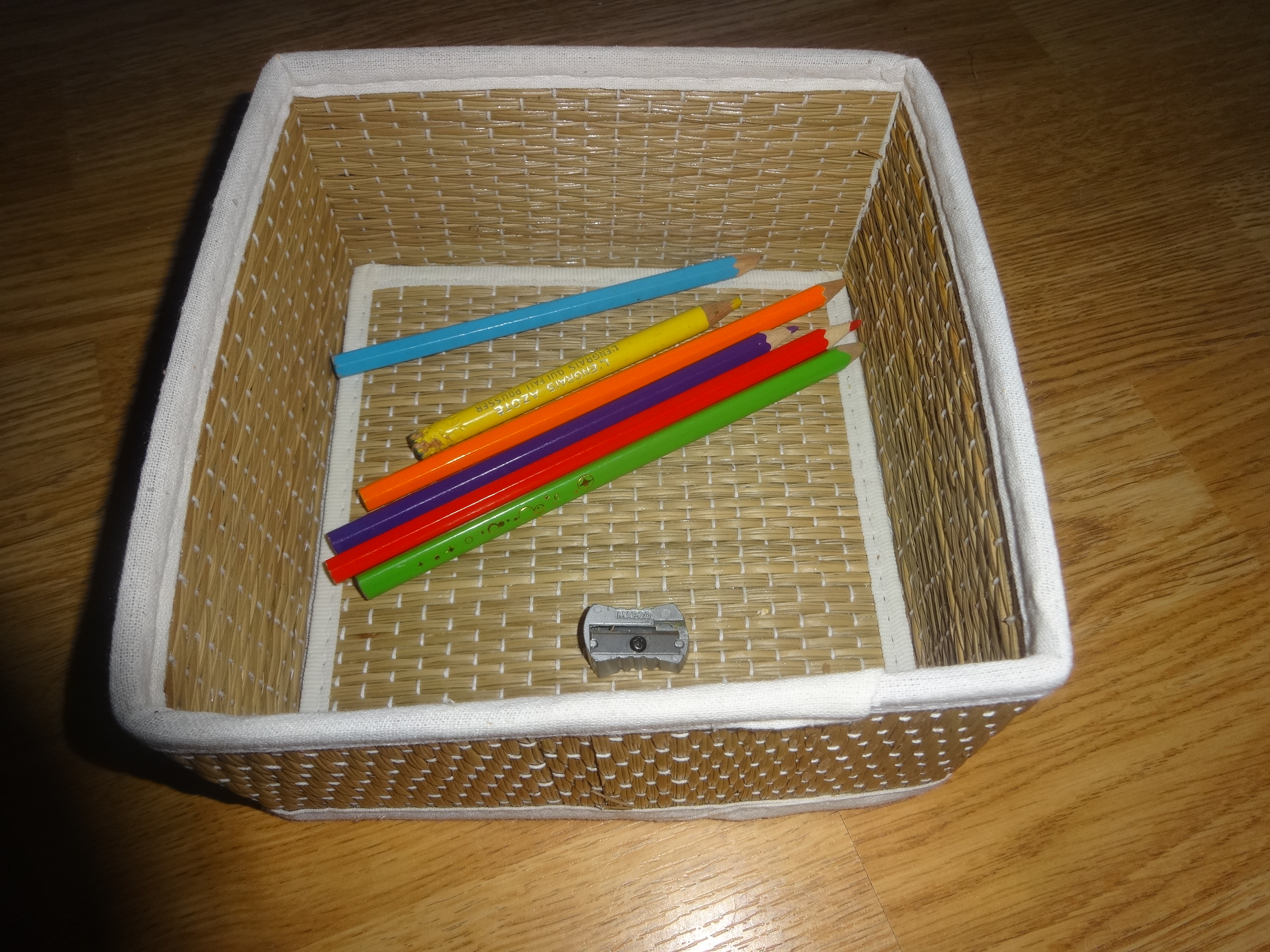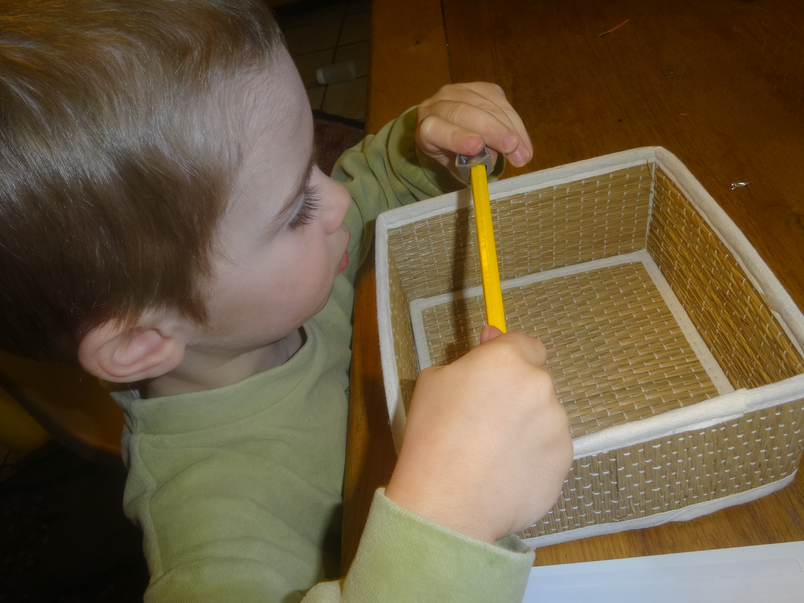 Noé l’autre jour dessinait et avait besoin d’un crayon de couleur jaune. Il va le chercher mais il n’était pas taillé. Alors, bien-sûr, il me demande de le tailler ! Plutôt que de lui dire oui, j’ai préféré, après lui avoir montré comment faire avec un autre crayon, lui donner un taille-crayon et un petit panier et je lui ai dit d’essayer de le faire tout seul (selon le célèbre précepte montessorien « aide-moi à faire tout seul ! »)