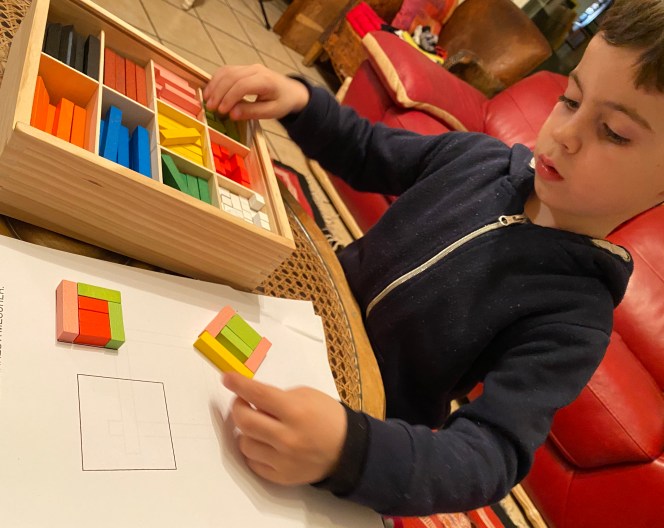 Depuis quelques jours, Firmin a envie d’activités mathématiques et ce sont les réglettes Cuisenaire dont je vous avais déjà parlé ici et ici qui sont de sortie ! Cette fois-ci, Firmin a essayé de remplir des carrés de différentes dimensions avec les réglettes.