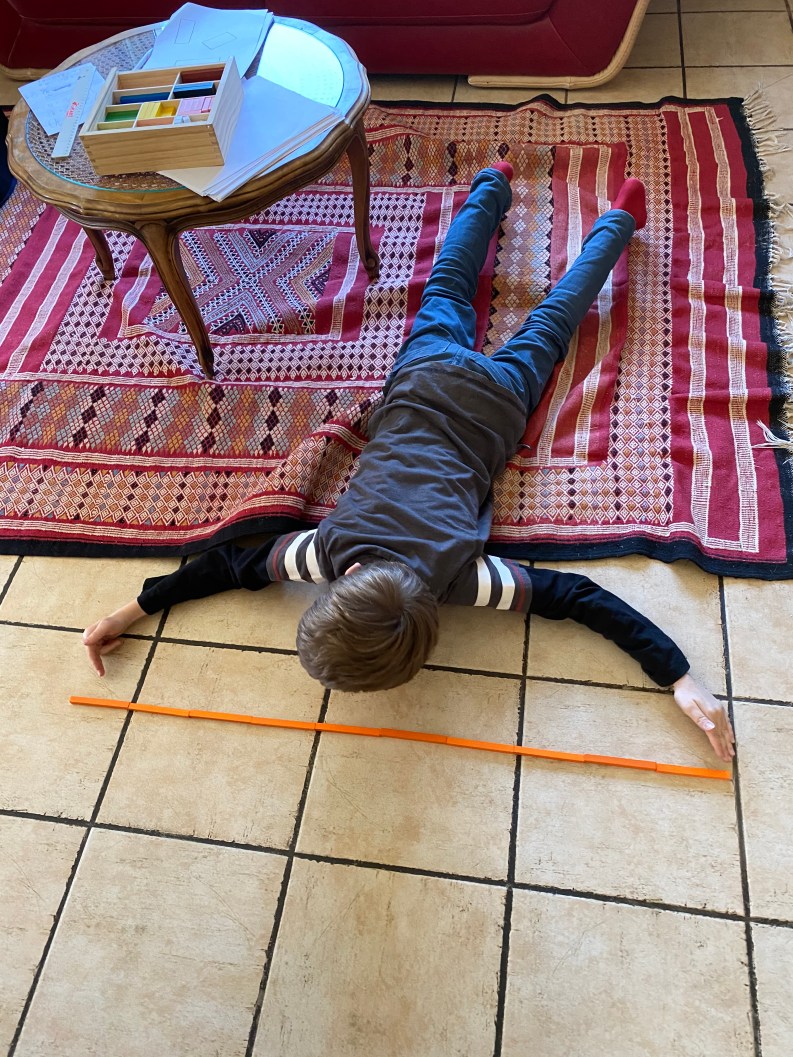Et puis Noé s’est mis à aligner 10 réglettes oranges les unes à côté des autres : ça fait 1 mètre !!! Ah et tiens, remarque-t-il, trois carreaux de notre carrelage, ça correspond pile à 9 réglettes, donc 90 cm. Ah ben un carreau mesure donc 30 cm de côté !