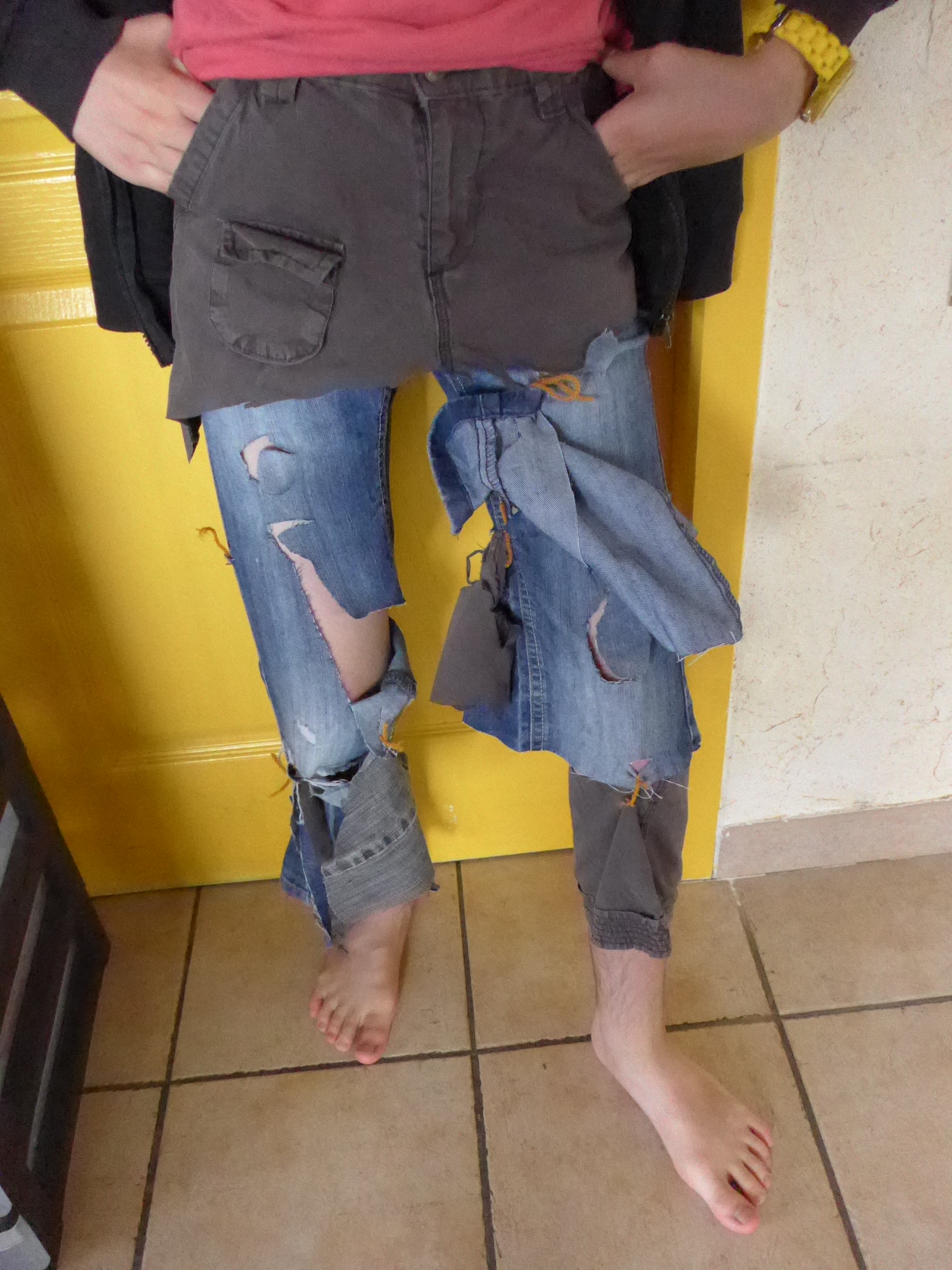 Après avoir farfouillé dans les déguisements, et en avoir sorti foulard, chemise et mousquet, Firmin décrète aussi qu’un pirate , ça a des bottes alors il va chercher ses bottes de pluie ! On rajoute un crochet que l’on insère dans son attelle ! ( oui, parce que Firmin a eu la bonne idée d’avoir une fracture pendant les vacances …)