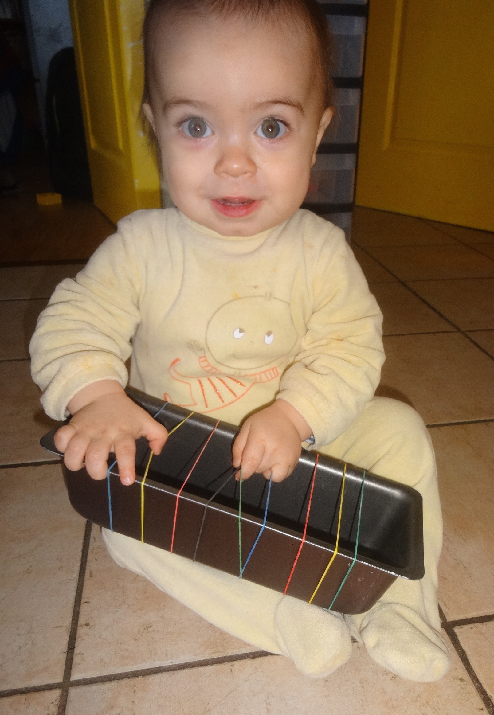 J’ai proposé à mon petit Firmin un instrument un peu rudimentaire mais rigolo ! Il s’agit d’un moule à cake sur lequel sont tendus plusieurs élastiques de différentes couleurs (c’est plus joli…) et si possible de différentes tailles.