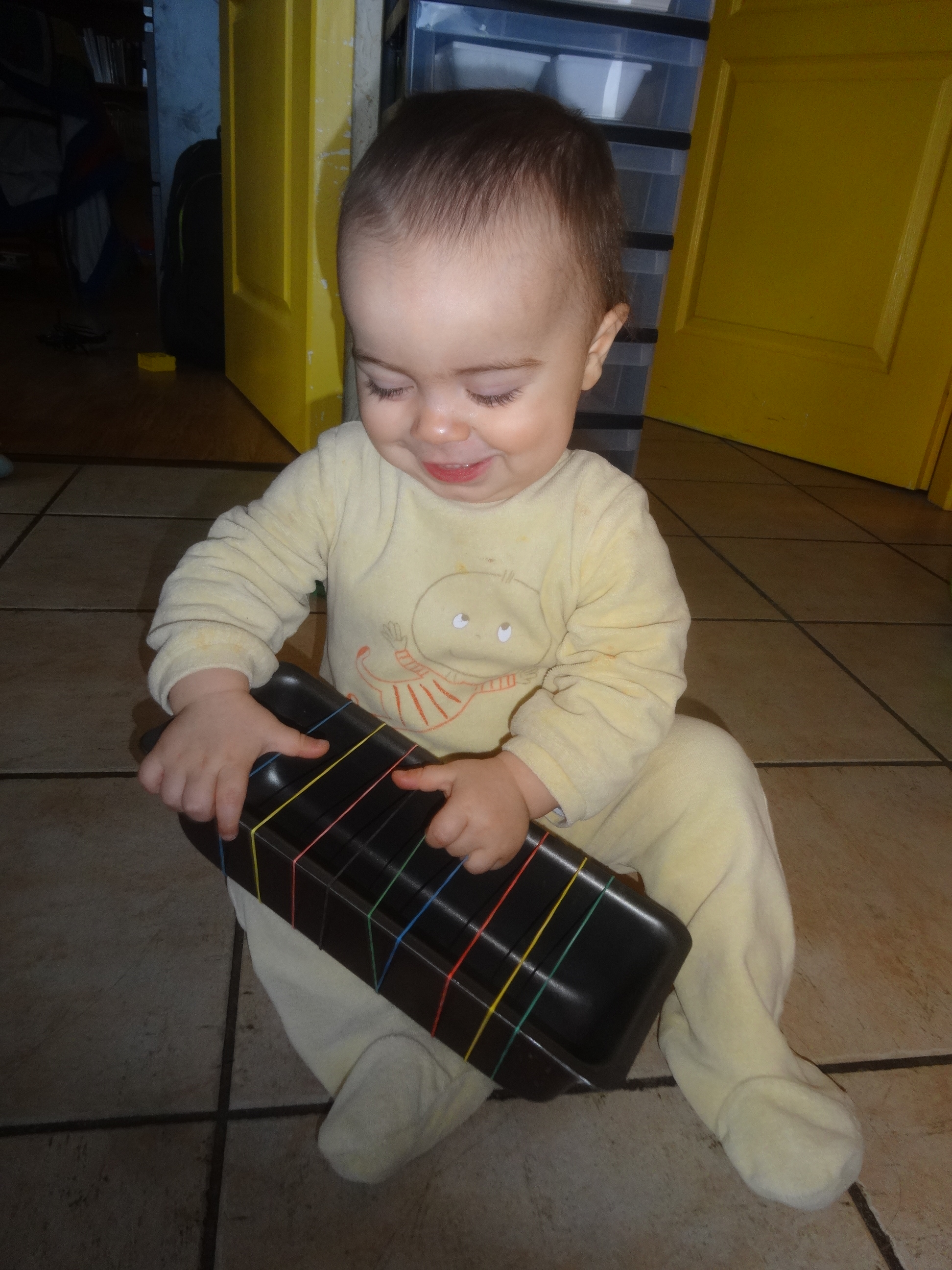 Firmin a tout de suite été attiré par mon drôle d’instruments à cordes ! Il tirait sur les élastiques et s’amusait à les faire sonner.