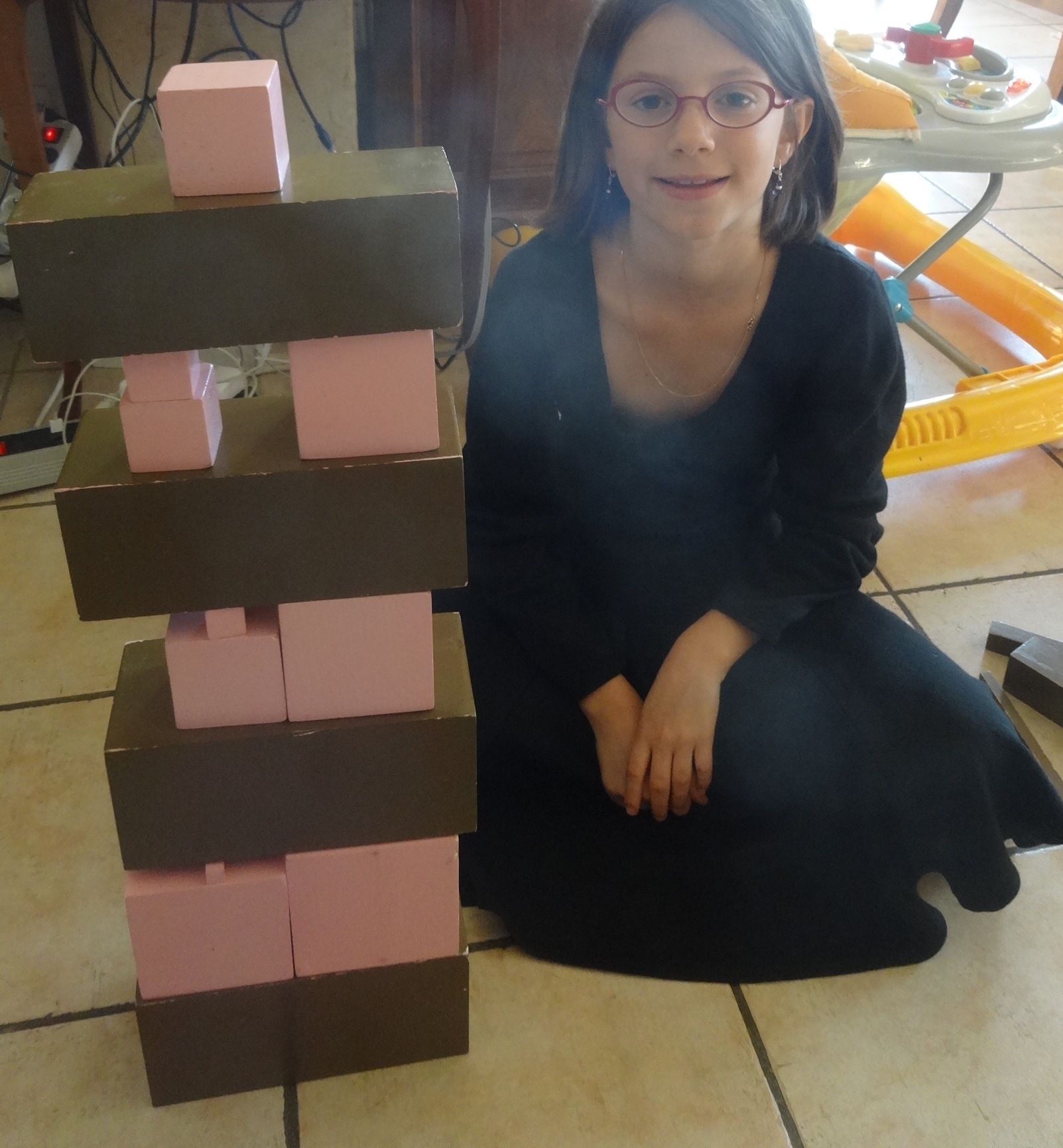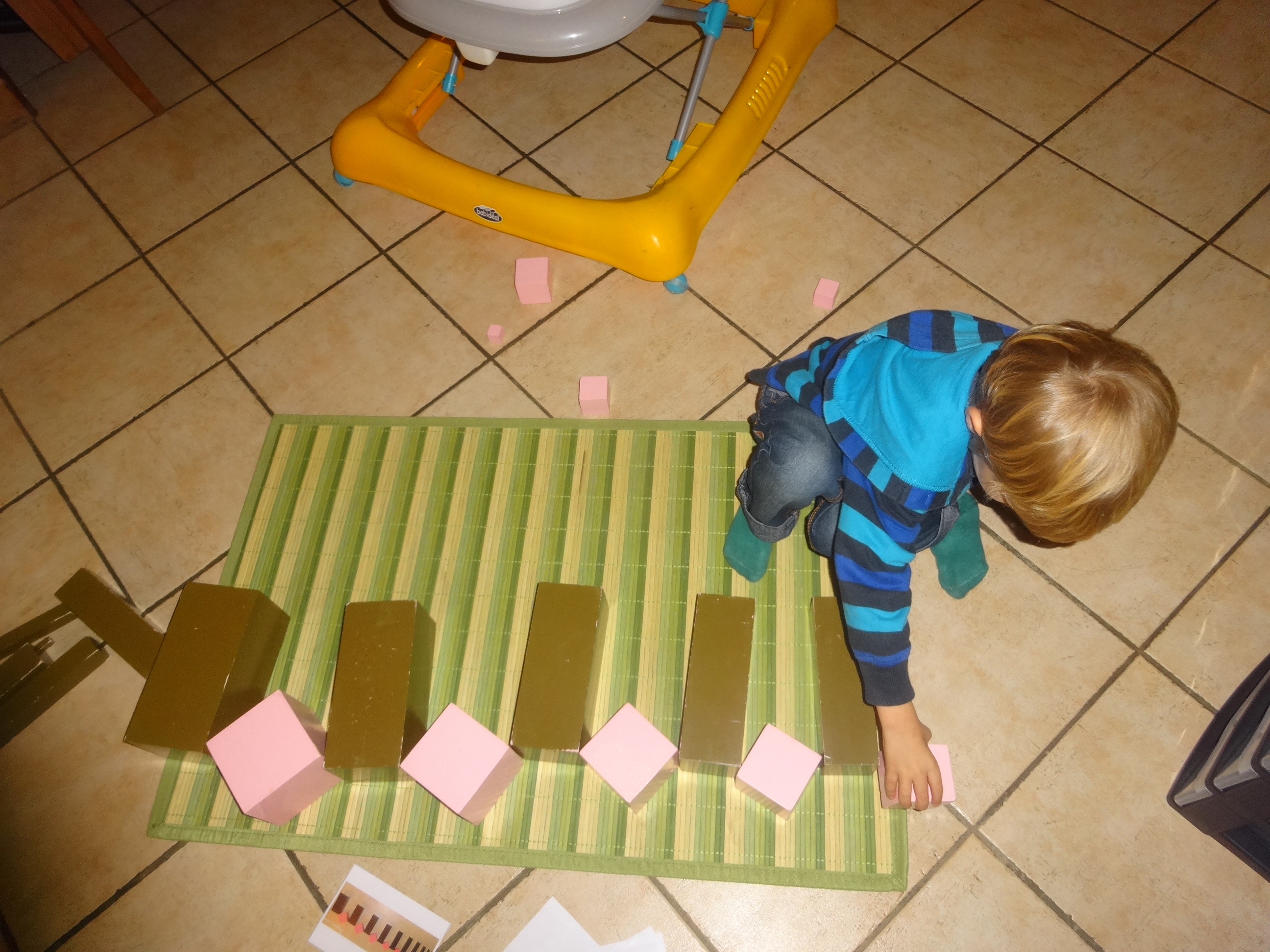 Et effectivement, à la maison, on retrouve ce goût pour porter les gros cubes lourds, (c’est pour ça que les cubes en bois plein, c’est bien, car l’enfant ressent le poids des objets, ce qui n’est pas le cas pour des cubes en plastique ou en carton), les empiler et les jeter. Bon, jeter les briques, ça ne me dérangeait pas, mais jeter les cubes de la tour rose Montessori , j’aime moins …