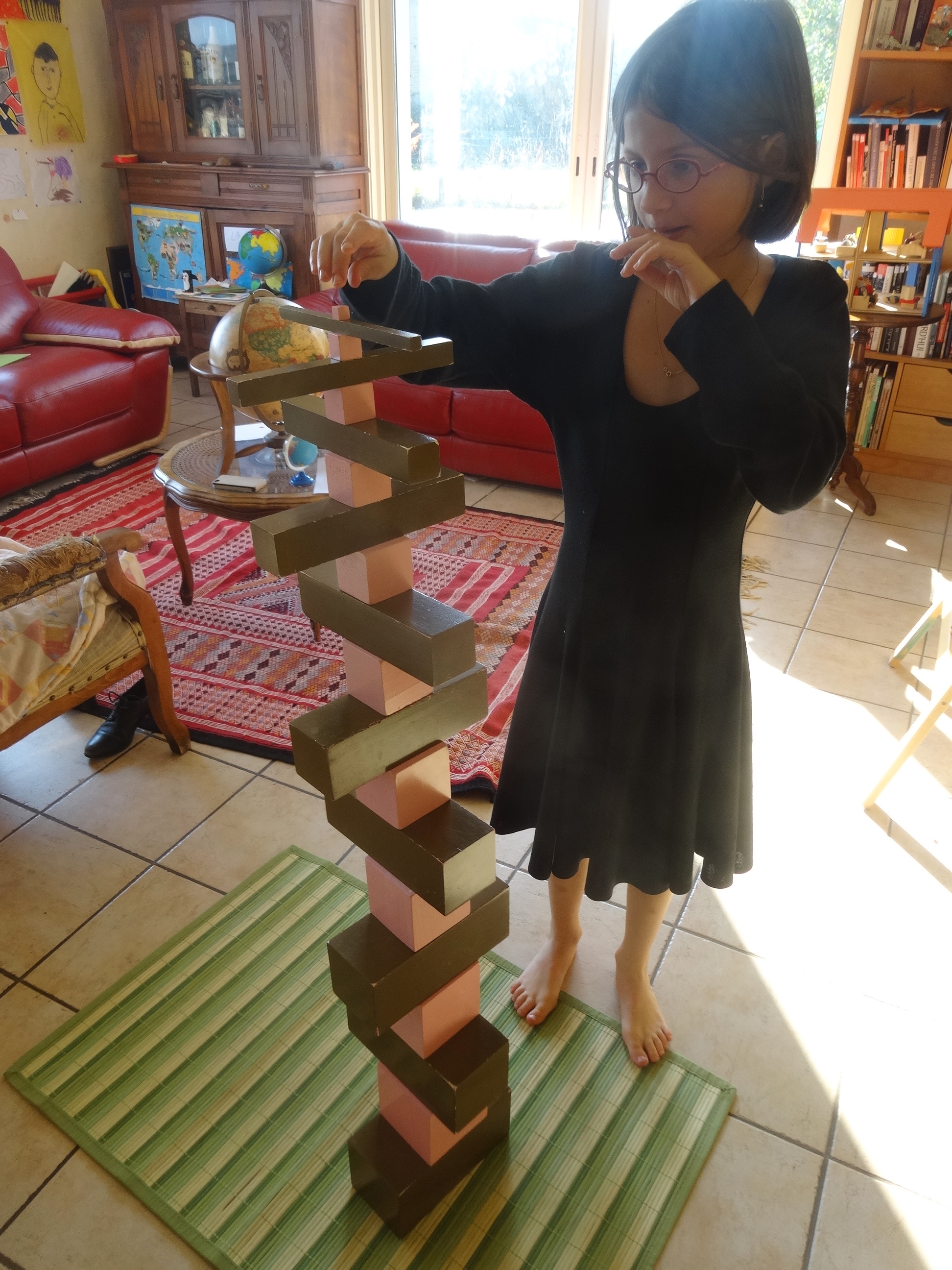 Et l’escalier marron aussi il aime bien ! Et ce jour là, il posait les barres à la verticale et essayait de les empiler également. Pas facile !