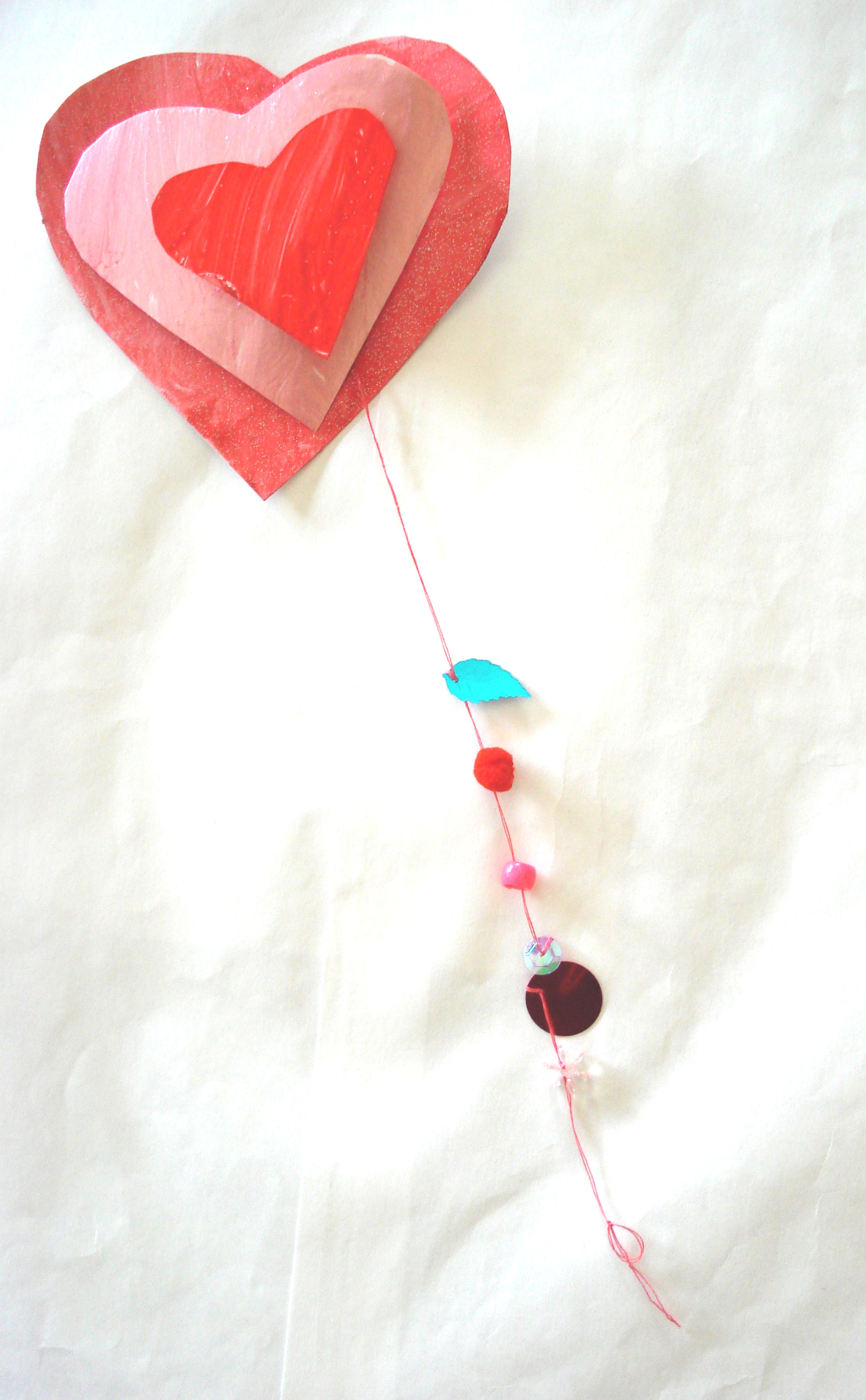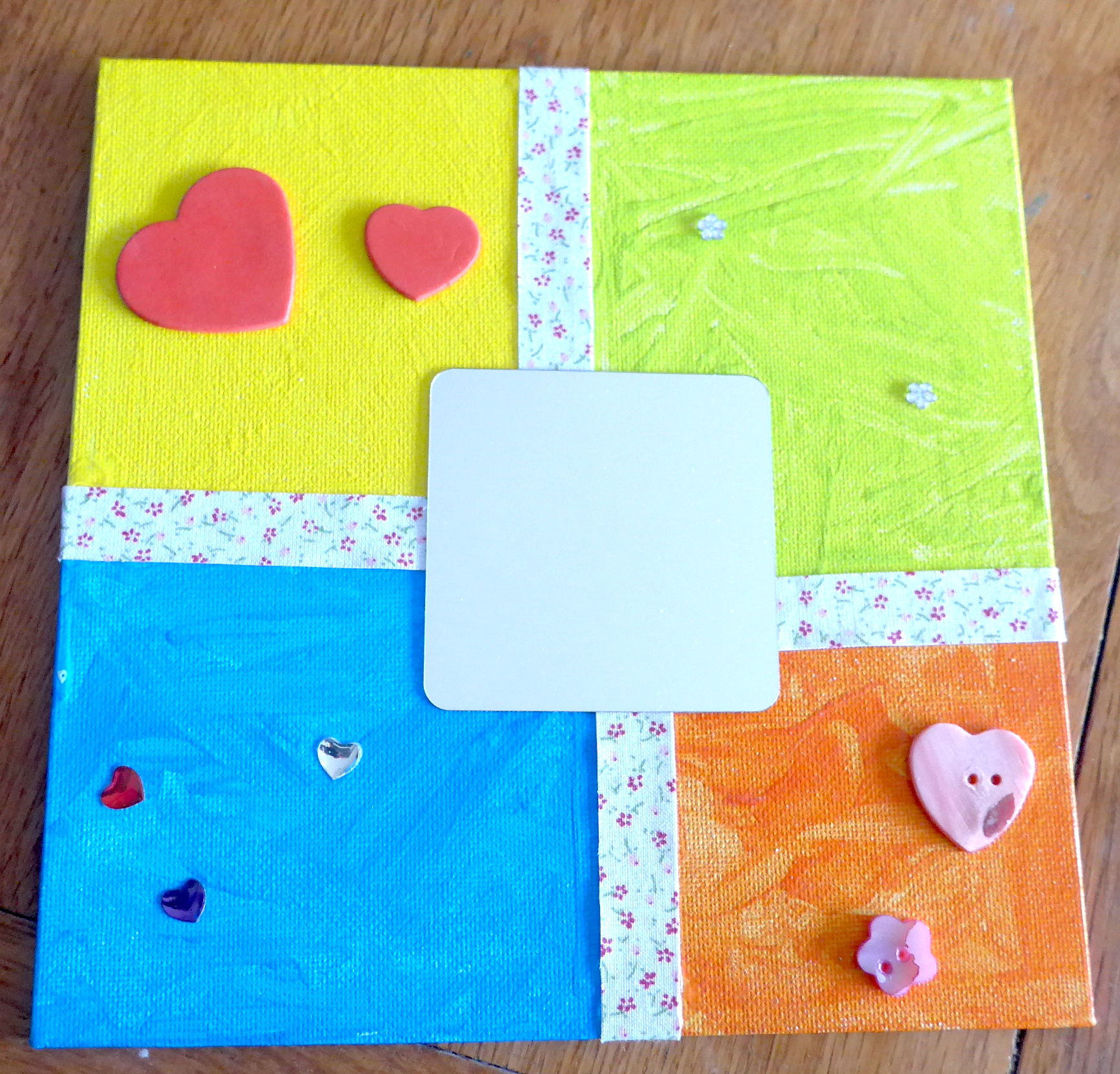 Noé un joli collage : il m’a expliqué qu’avec un gabarit il avait tracé un coeur, puis il a déchiré des petits papiers colorés verts et rouges qu’il a collés sur le coeur. Enfin, il a réalisé des carrés de papier rose à l’aide du perforatrice et les a collés tout autour pour faire un cadre. Le tout recouvert de vernis-colle , et avec un petit poème au dos !.
