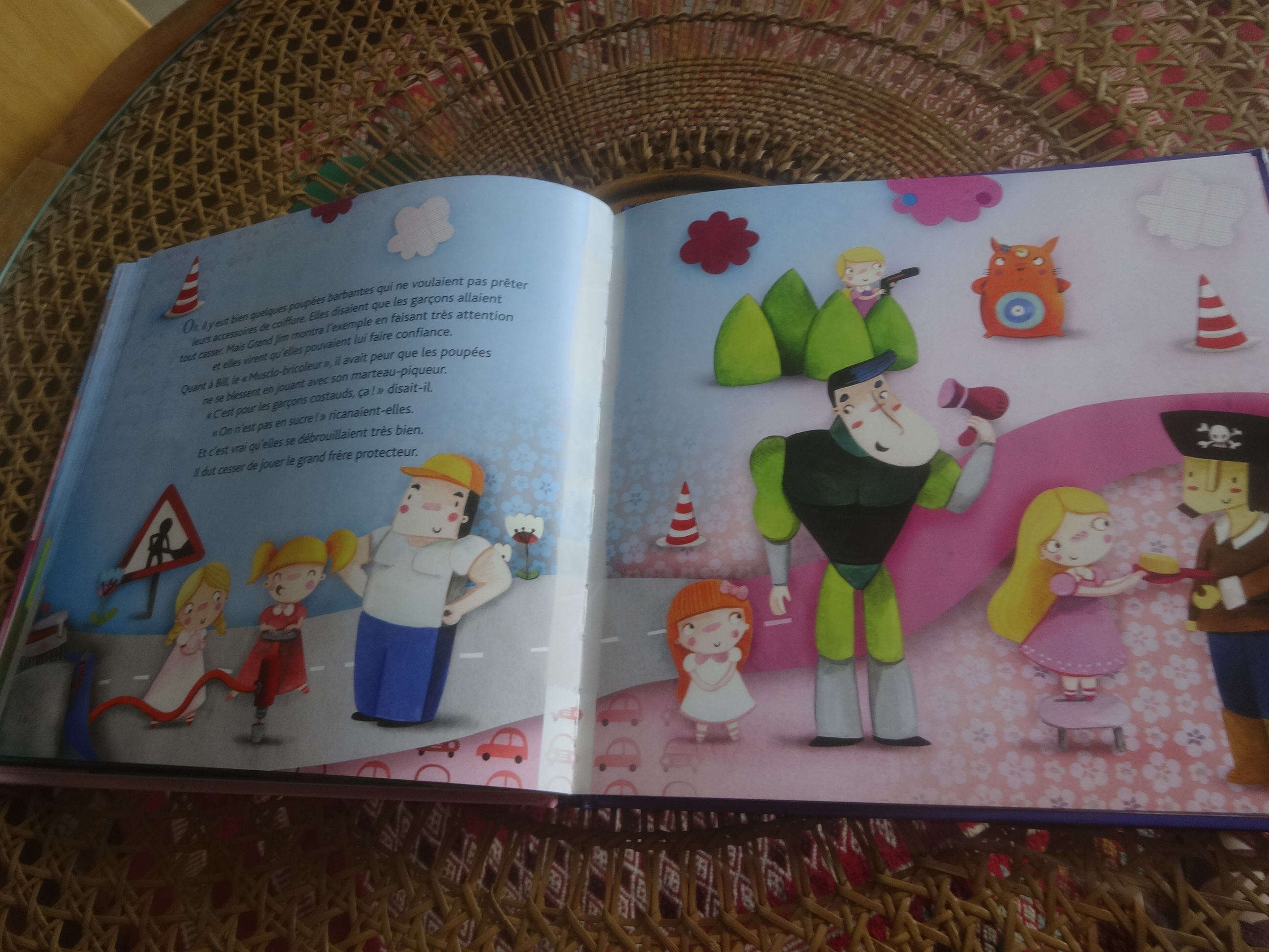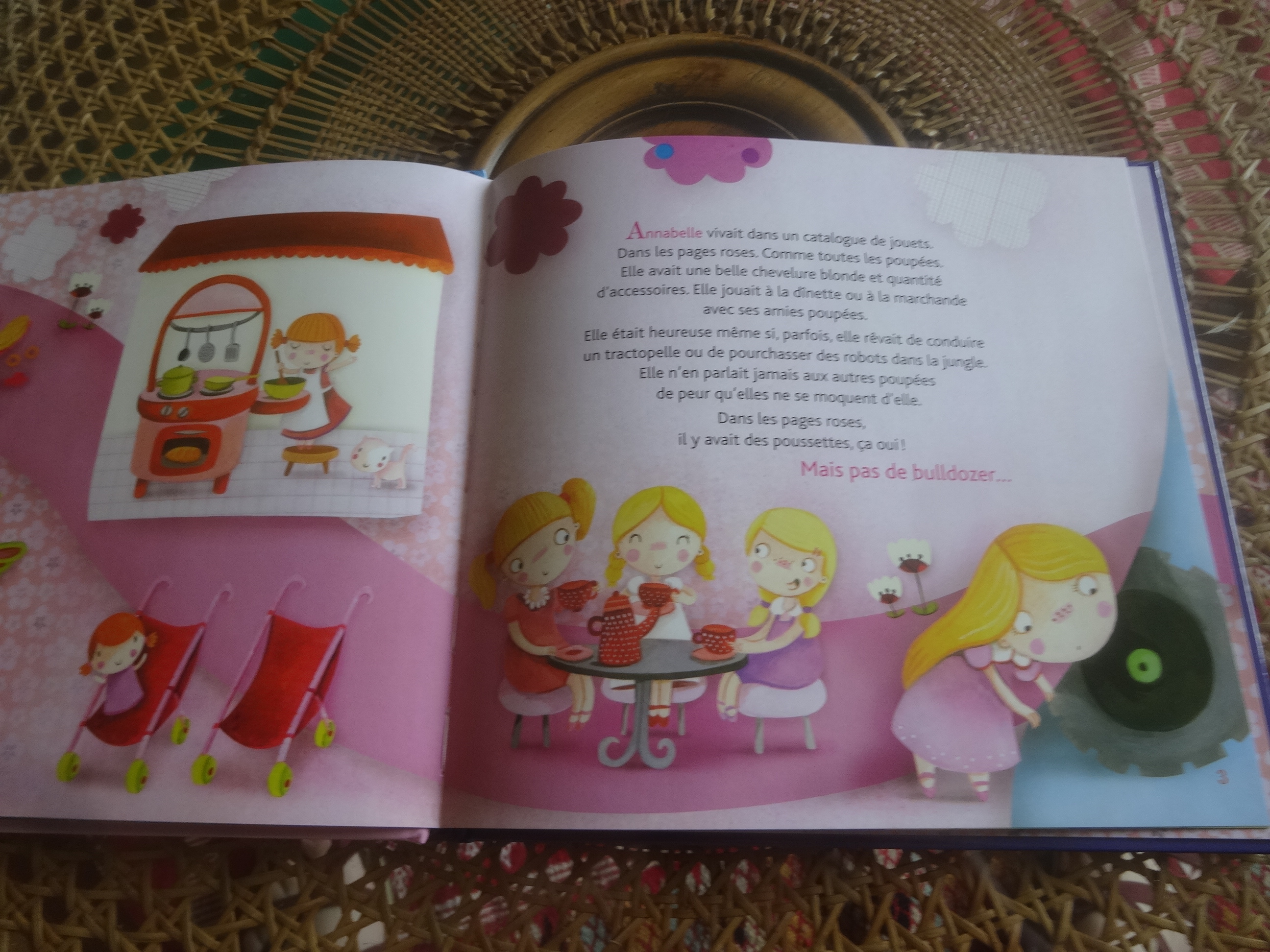 Nous avons donc une jolie petite poupée qui vit heureuse ma foi dans les pages roses avec ses copines poupées à jouer à la dînette et à boire le thé. Mais quand même. Elle rêve de pouvoir aller sur un tractopelle ou de jouer avec un robot. Mais bon, on se moquerait d’elle. Et puis de toute façon, chez elle, il n’y a ni robot ni tractopelle, seulement des poussettes.