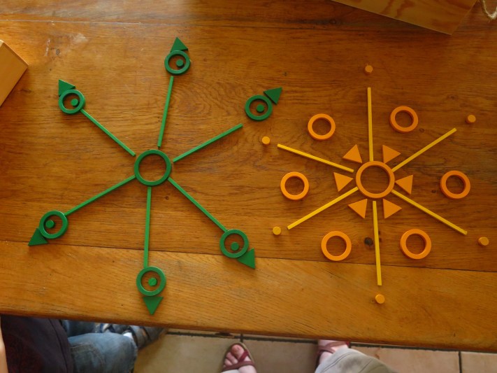 Donc avec Noé, nous avons choisi une couleur chacun, moi le jaune, lui le vert, et nous avons pris exactement les mêmes pièces : un rond central et six éléments de différentes sortes : 6 bâtonnets, 6 petits cercles, 6 points, 6 triangles puisque notre but était de faire des mandalas ! Au début nous nous sommes placés l’un à côté de l’autre, mais on peut aussi cacher ce que l’on fait pour ne pas s’influencer et ensuite avoir la surprise de nos deux constructions !