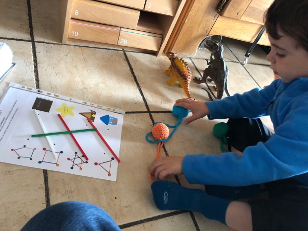 Puis une fiche où l’on doit relier (avec les bâtonnets) un dessin de la forme réalisée avec les balles. Puis Firmin réalise ces formes avec ses balles.