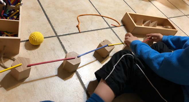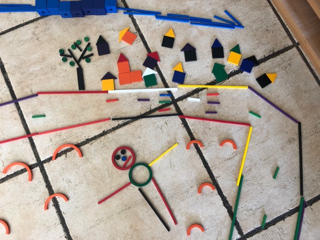 Et puis hier soir encore, on n’a pas pris de photo, mais Noé s’est intéressé à juste quatre losanges pour voir tout ce qu’on pouvait juste avec ces quatre formes ! C’était super intéressant ! La géométrie en jouant …