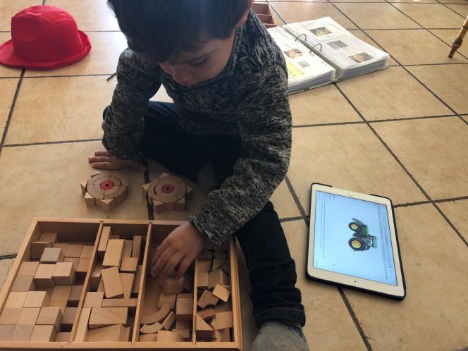 En ce moment, Noé sort beaucoup le spielgaben. Il installe le plateau, dispose toutes les boîtes autour …et démarre avec un projet en tête : construire un univers particulier.