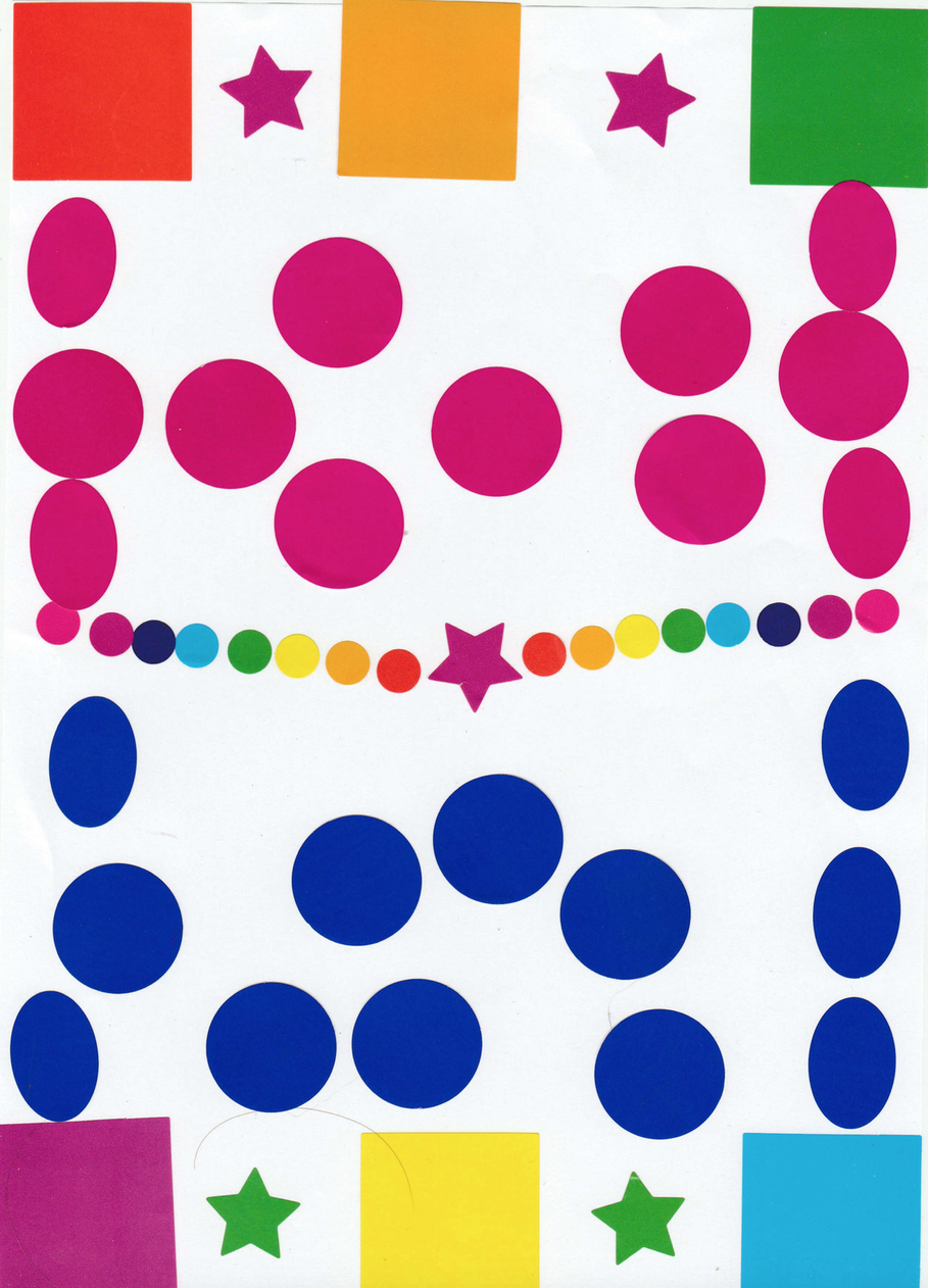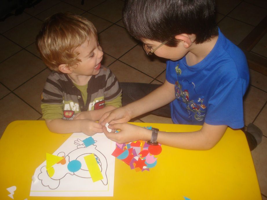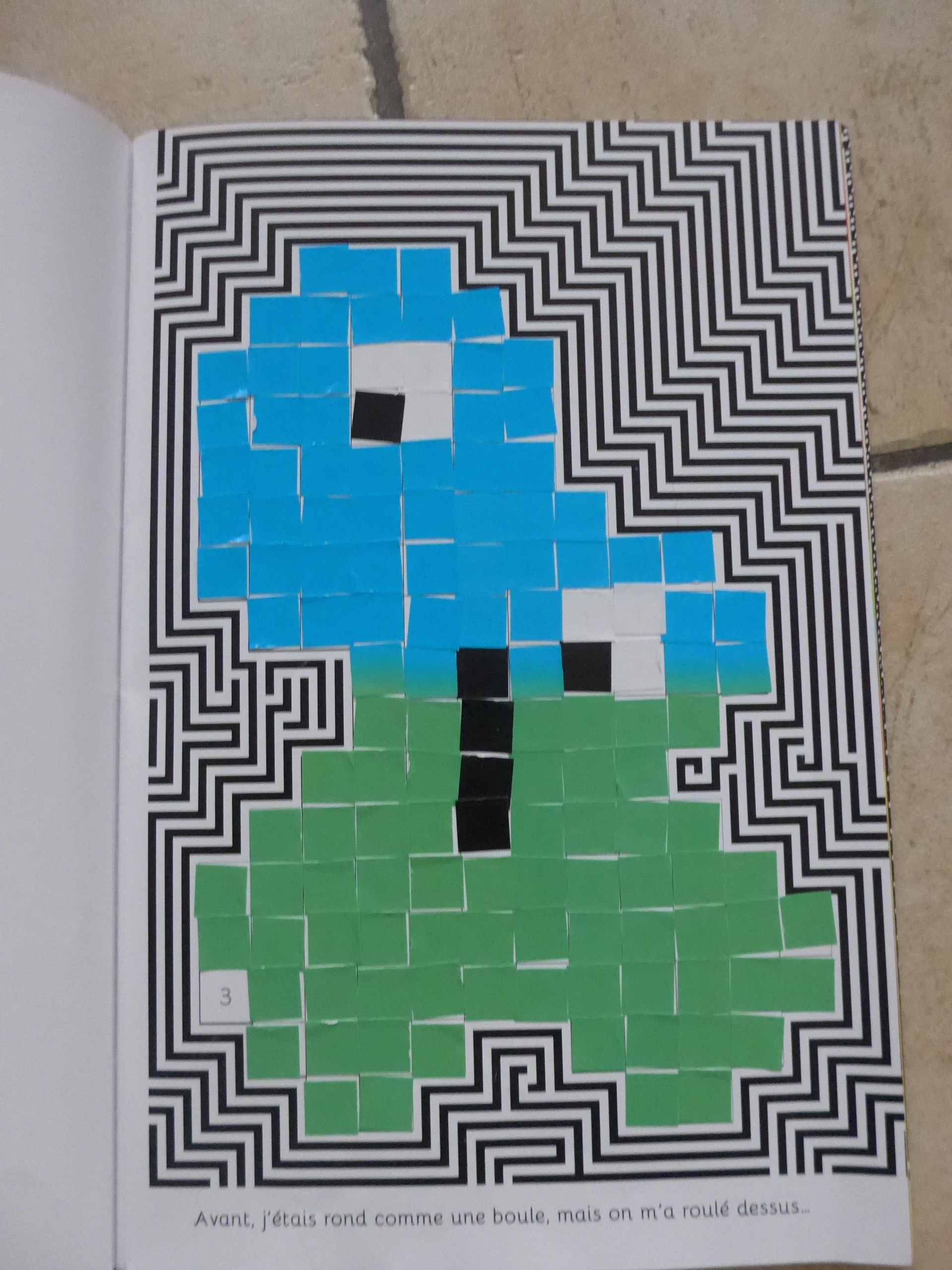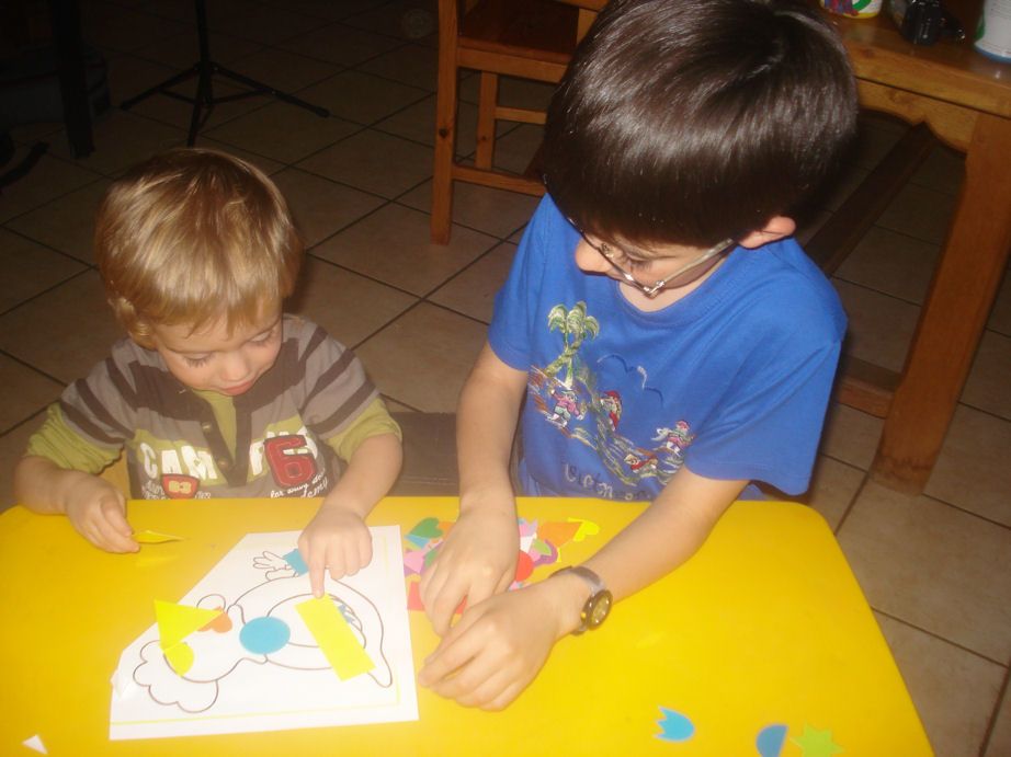 L’autre jour, Noé est allé chercher des gommettes et s’est installé … et bien … par terre ! Pour les gommettes qu’il a collées sur les bords, il s’amusait à retourner la feuille pour y coller l’autre moitié de la gommette (c’est ce qu’il fait sur la photo !)