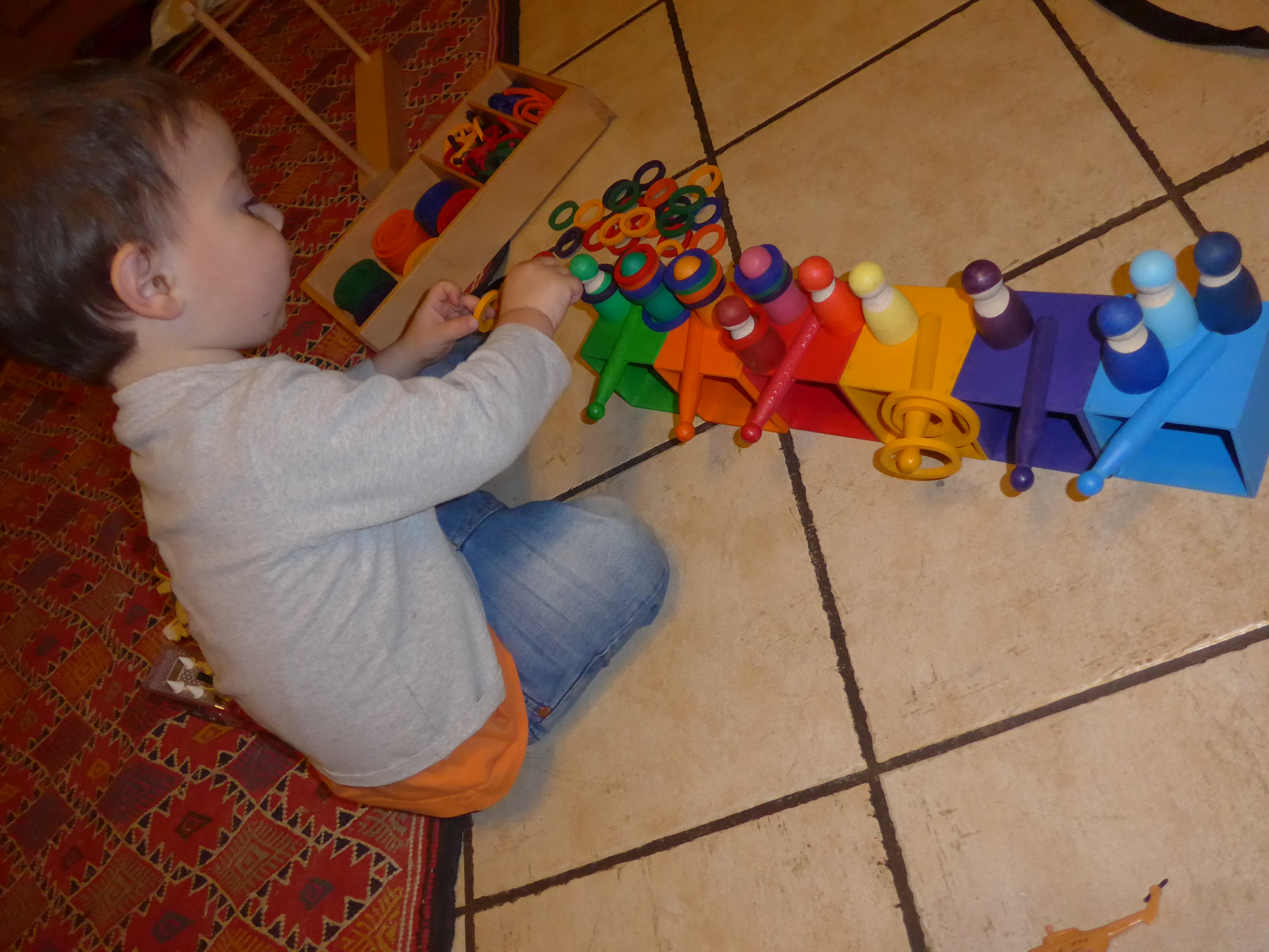 Firmin s’amusait à mettre les anneaux sur l’épingle de la bonne couleur (un geste pas si facile avec une épingle à l’horizontale).