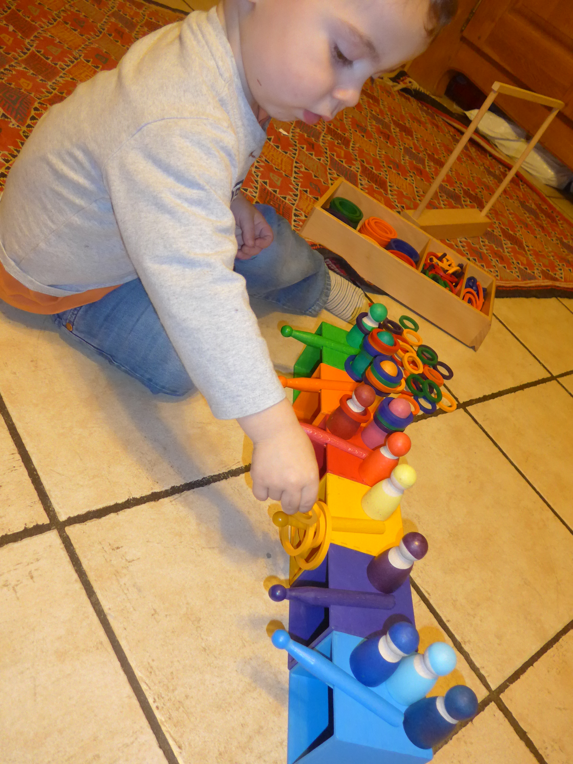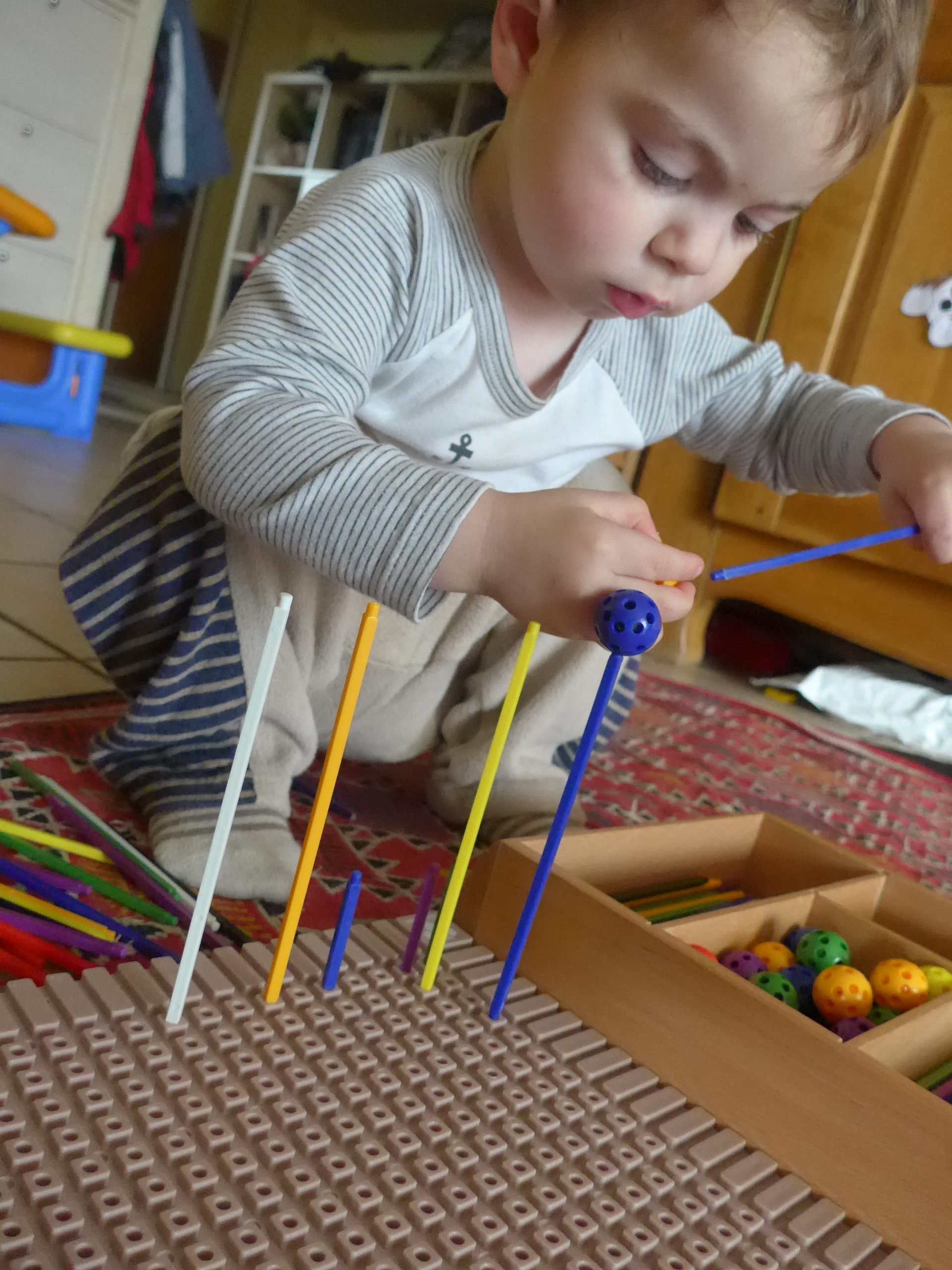 Cette partie du spielgaben est toujours sa boîte préférée, même s’il n’arrive encore pas bien à mettre les boules au bout des bâtonnets. Par contre, planter les bâtonnets sur la plaque grise lui pose moins de problèmes.