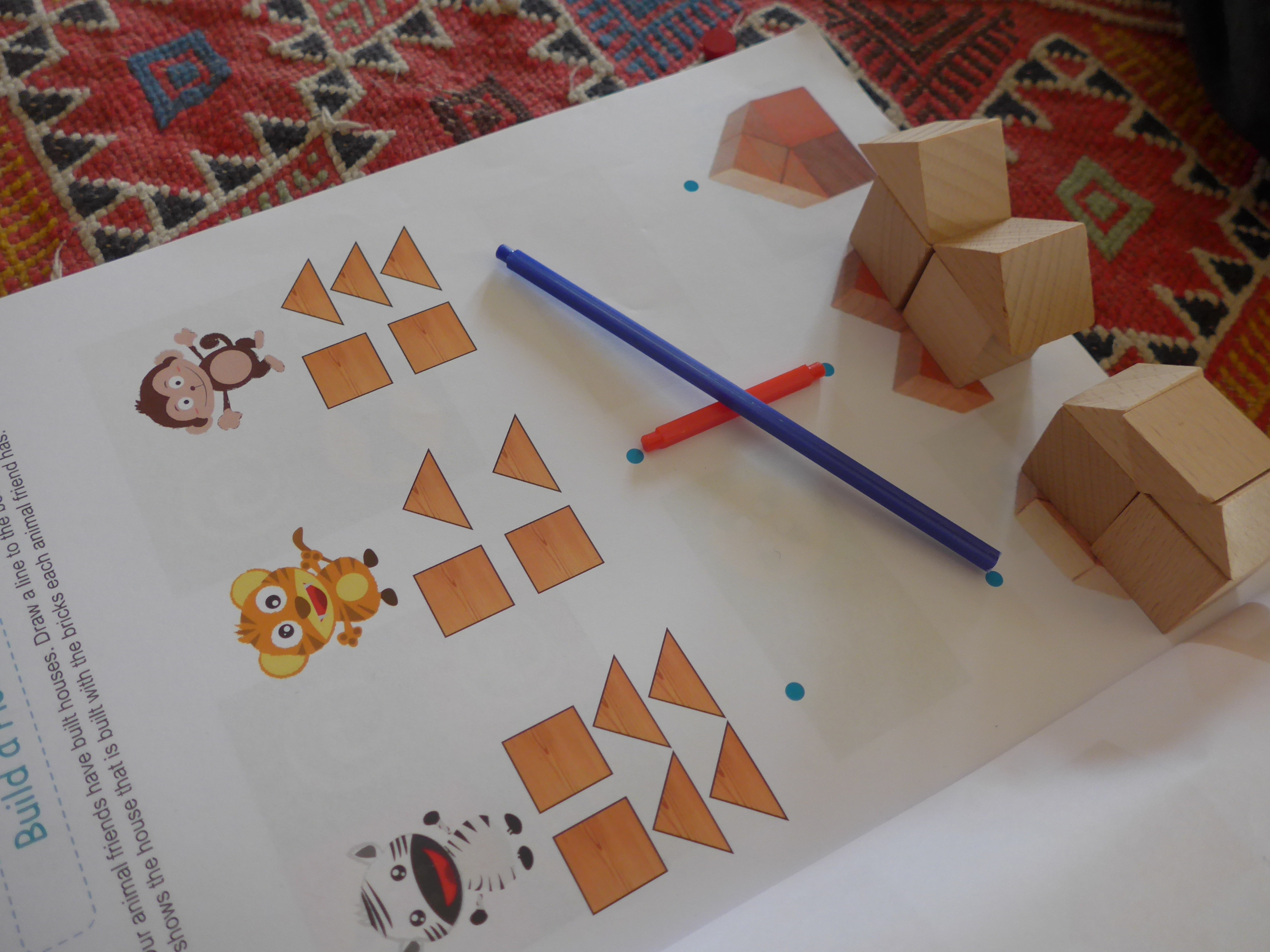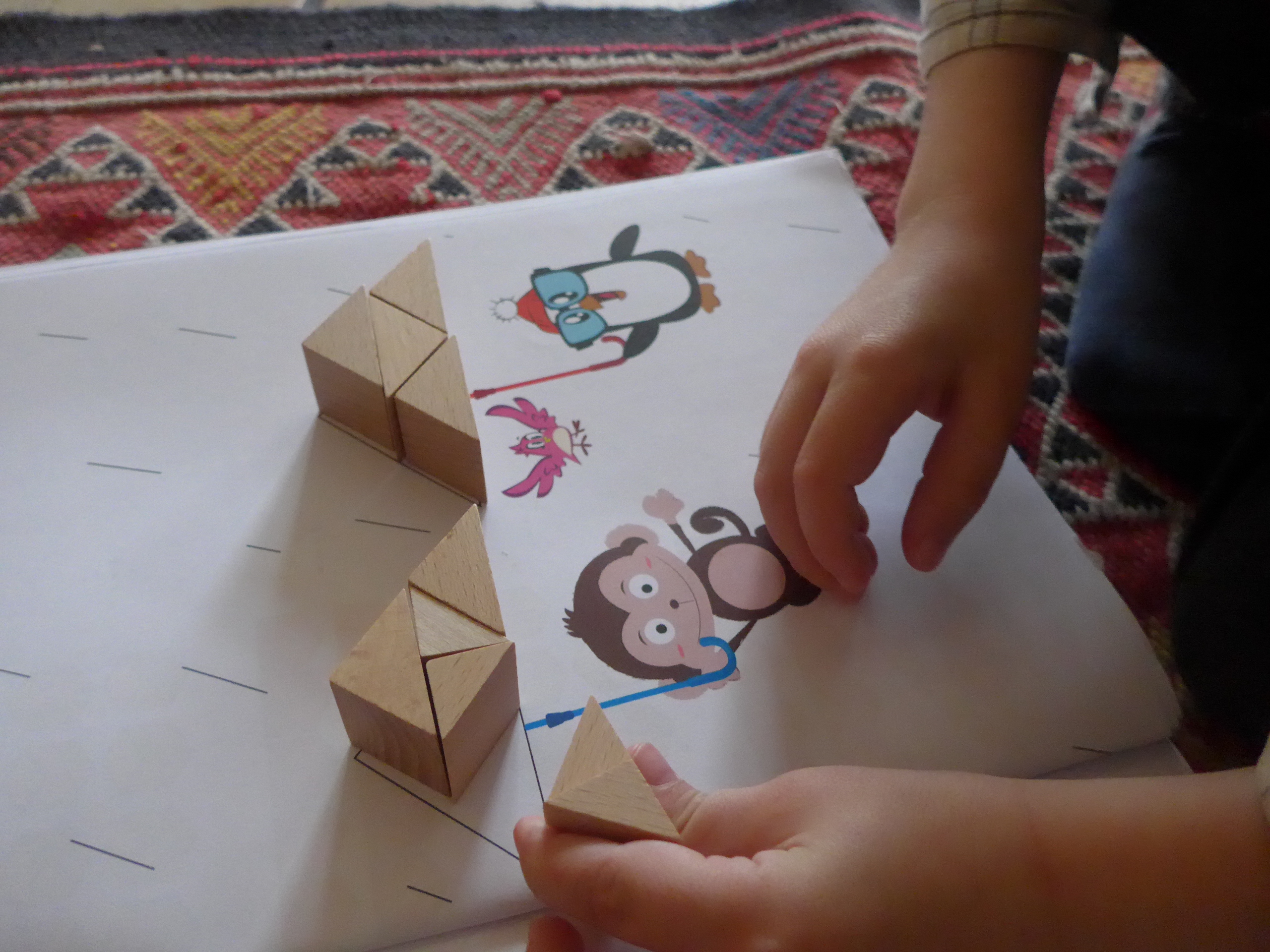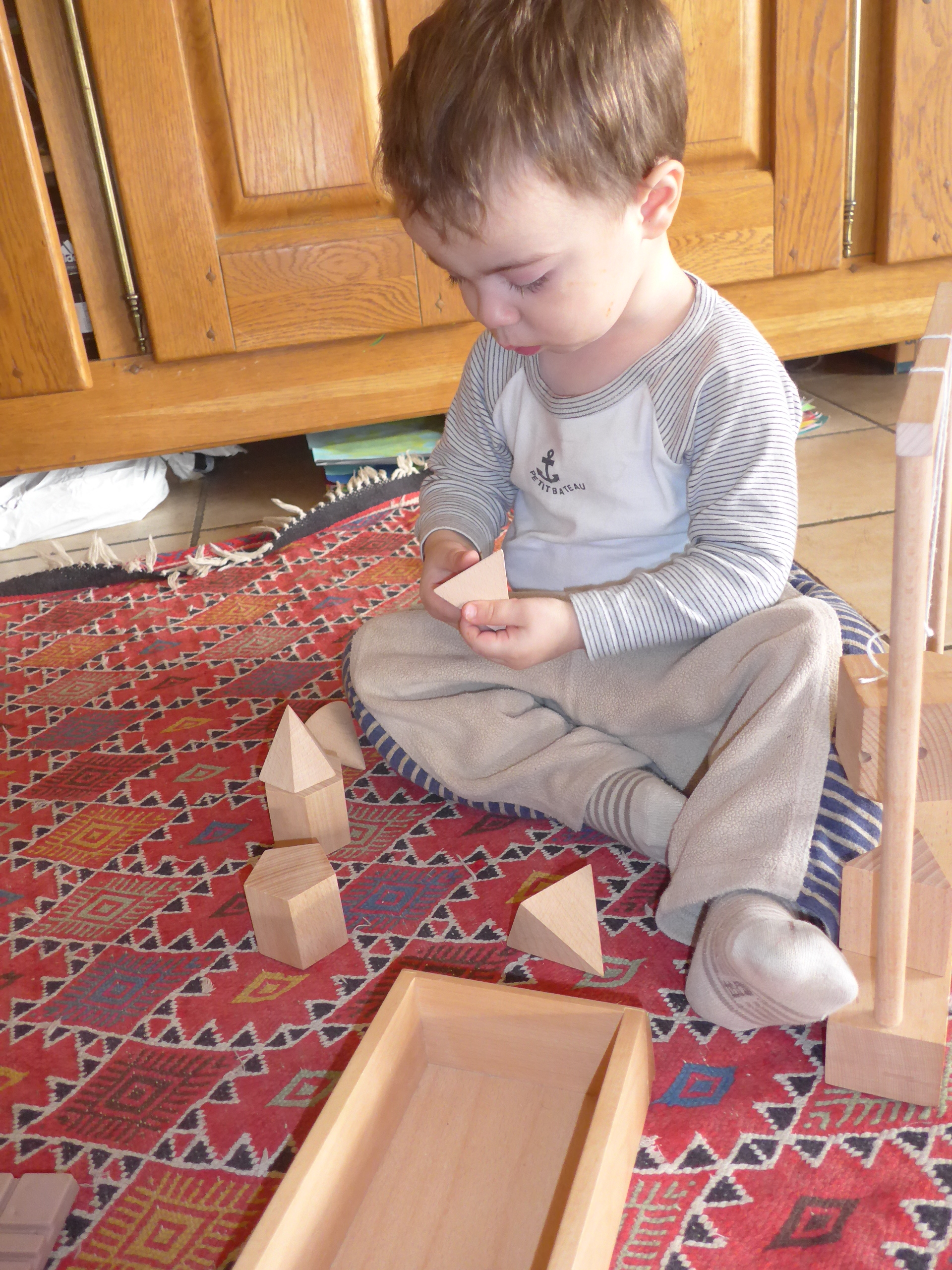 De temps en temps, Noé aime bien prendre les fichiers (je les ai reçus en fichiers pdf avec le spielgaben). Là il s’agissait du fichier du don 5 (c’est à dire des solides avec des cubes et des prismes triangulaires, grands ou petits)