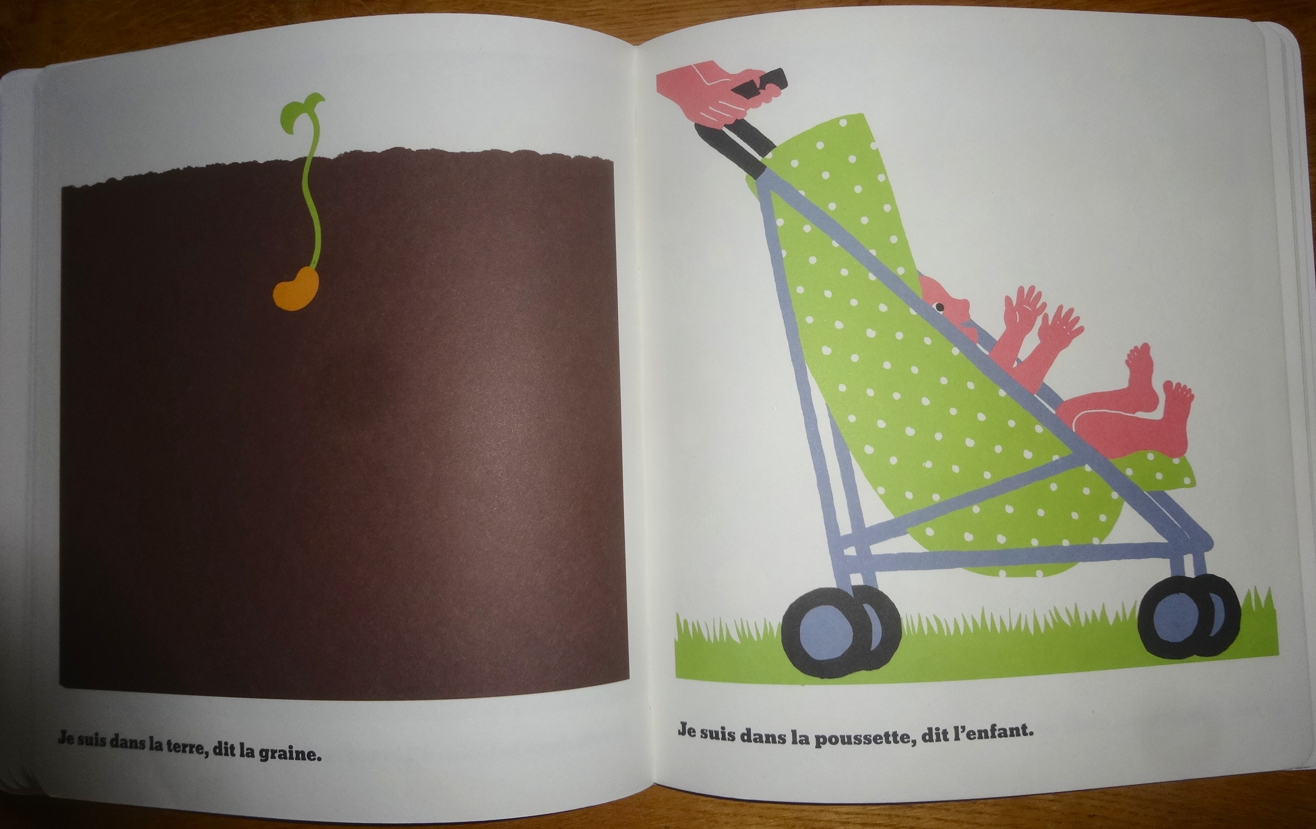 Le principe est tout simple : une double page avec une notion de temps qui passe entre les deux. Parfois, cela se passe sur quatre pages (saisons par exemple) ou même plus. Et puis des liens subtiles se font entre les pages …