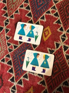 Ainsi, nous avons d’abord pioché quatre cartes, une dans chaque catégorie. Ce sera pour aujourd’hui : sachet de thé, couleurs vives, déchirer, cutter/ciseaux.