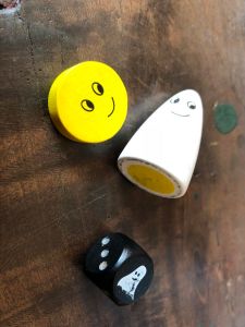 Des idées de nouvelles règles se dessinent déjà, comme par exemple : tirer une carte ; chacun commence une création. Puis on échange nos créations, on pioche une deuxième carte et l’on complète la création de l’autre !